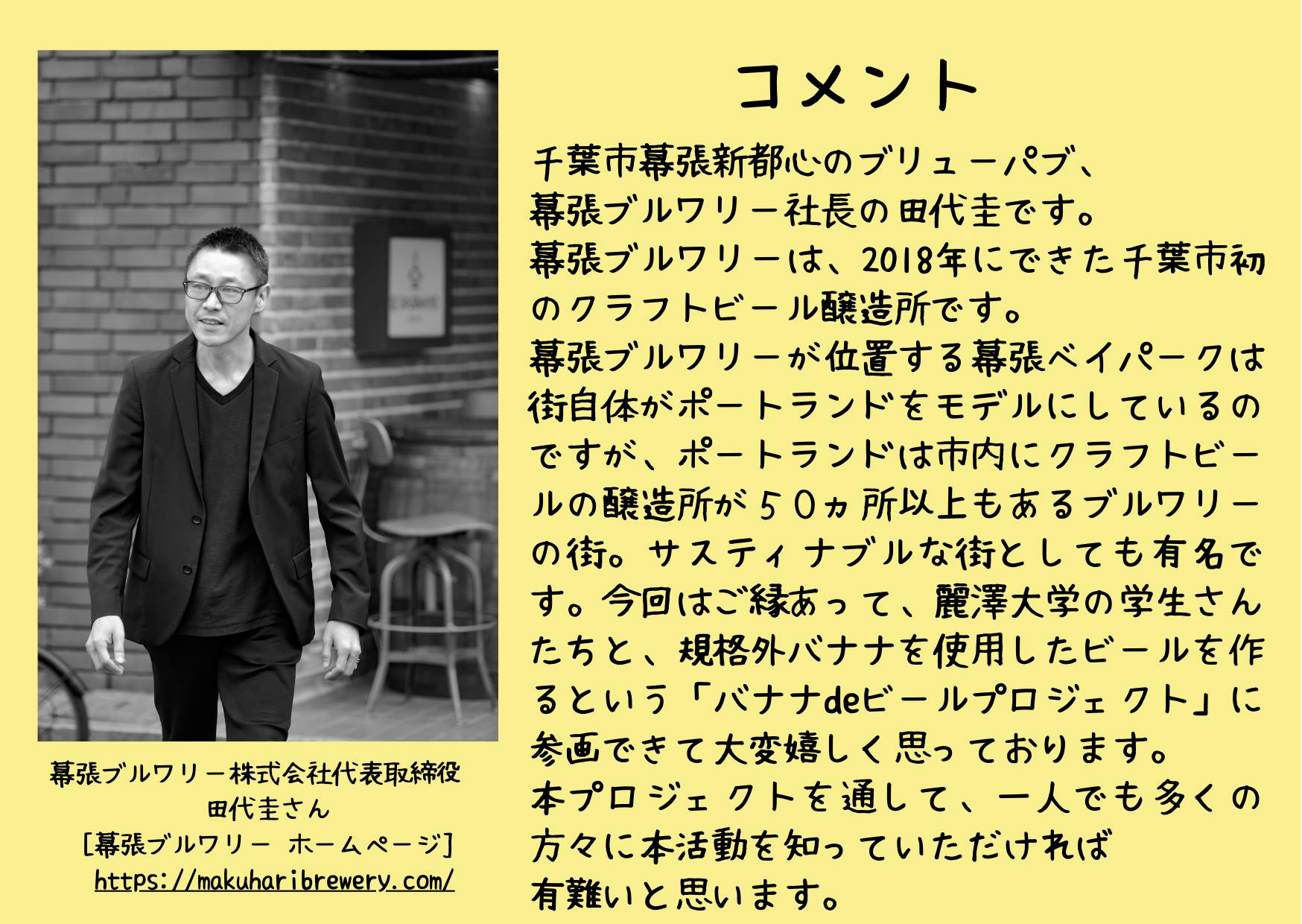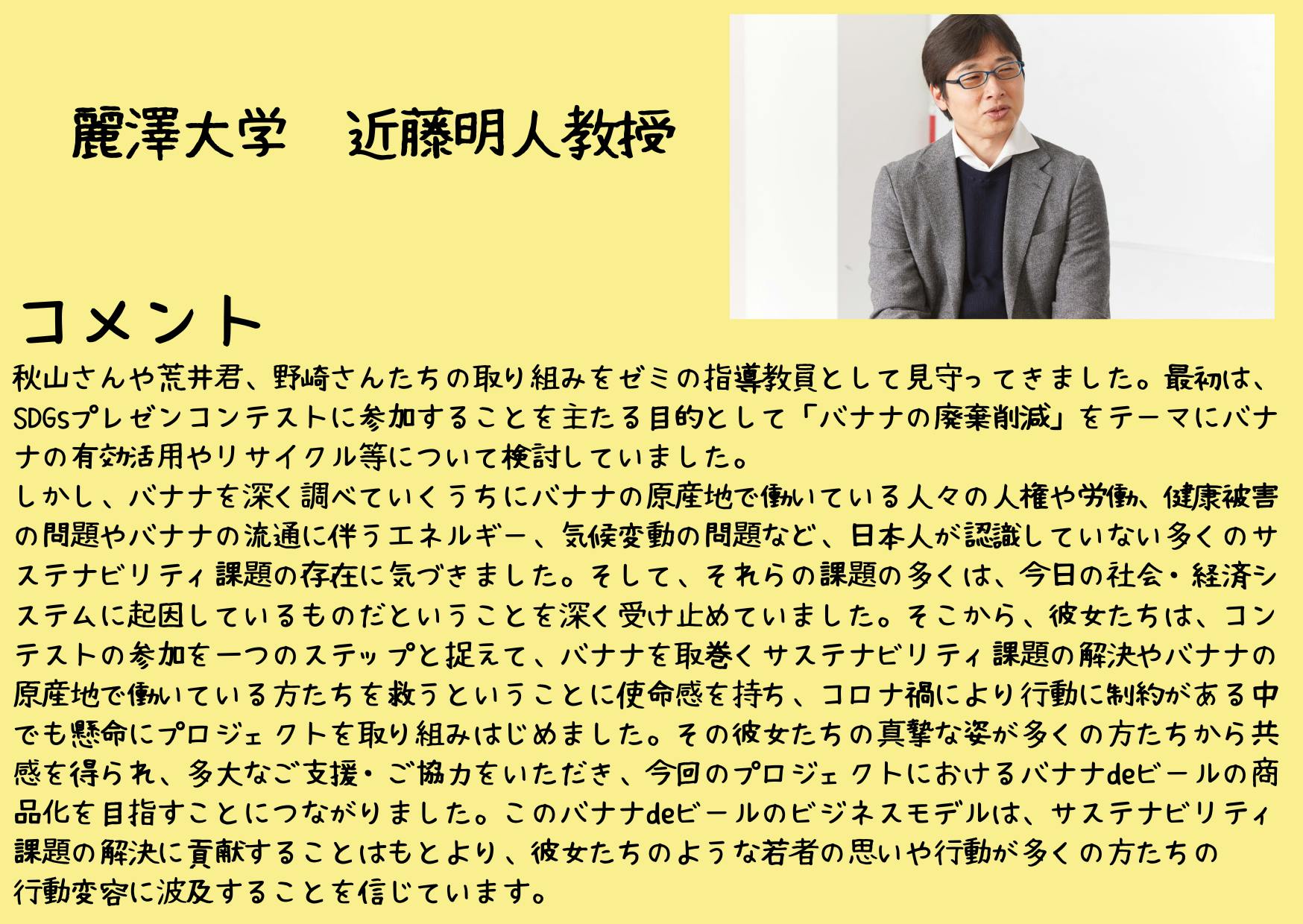 麗澤大学近藤ゼミ 7期生メンバー私たちバナナビールのプロジェクトメンバーが所属する【近藤ゼミ】は近藤先生ご指導の下で、自分が決めた目標やプロジェクトに対して責任感と利他心を持ち、実際に現地調査などを行い、自発的に行動を行うように心掛けている本当に素敵なゼミです。