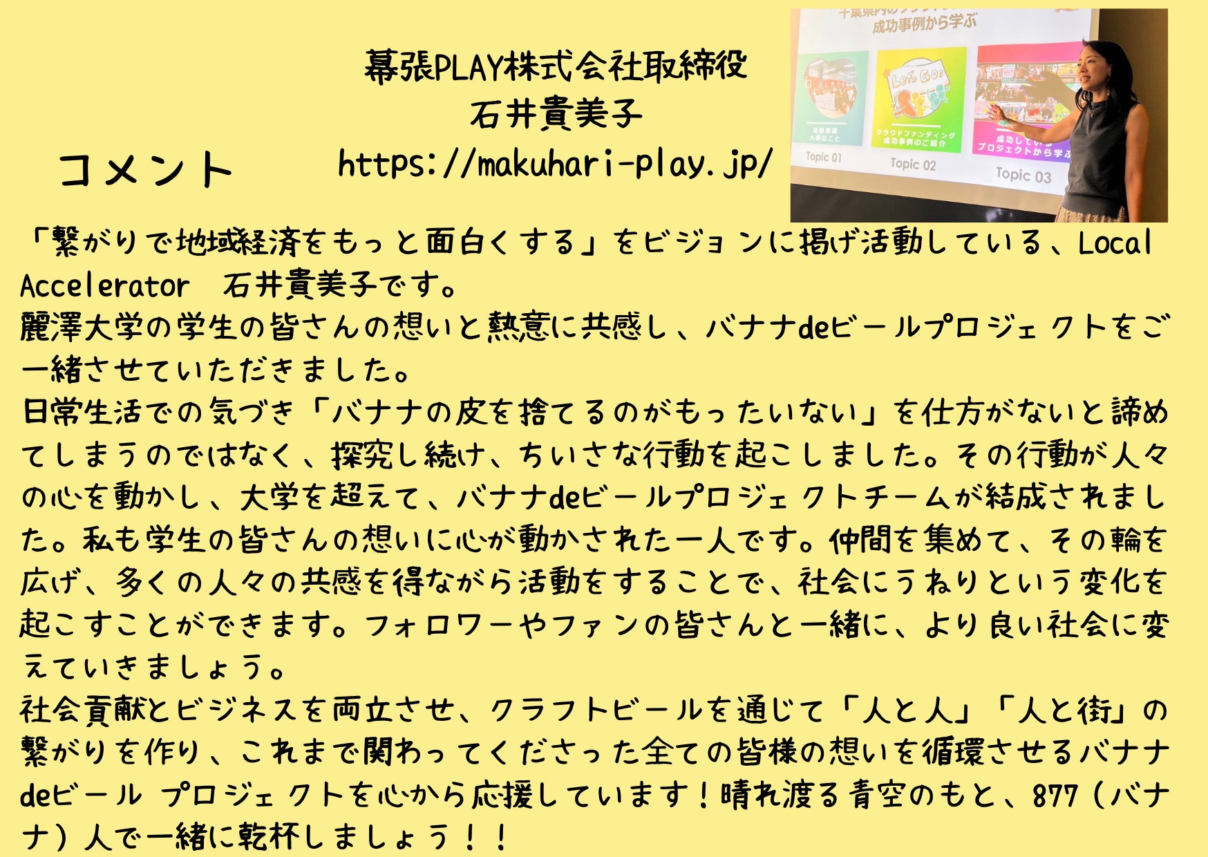 2023/10/31 16:00皆さま こんにちは!877ビールプロジェクトの秋山です!昨日、私たちのバナナビールプロジェクトのクラウドファンディングが終了いたしました。皆さまからのご支援や応援メッセージが力となり、私たちの目標金額を達成し、130万8千350円になりました。沢山の応援をしてくださった皆さまへ心より感謝申し上げます。今はリターン発送に向け、精一杯準備をしております。皆さまのもとへバナナビールが届く日を想像すると、私たちが去年アイディアからスタートしたプロジェクトが多くの方々にご協力いただきながら大きな形となっているんだと実感します。楽しみに待っていただけたら嬉しいです。このプロジェクトを始めたきっかけは、クラウドファンディングのページでご紹介させていただいたように、学内で毎年開催されるSDGsフォーラムに出場するためでした。私はこのフォーラムに参加をすると決めたとき、全ての時間をこのプロジェクトにかけ、絶対フォーラムで結果を残そうと決意し取り組みを始めました。そこからスタートし、今こうして多くの方々に支えられながら活動を続けられています。あの時、バナナに視点を置き、バナナの様々な背景を知り、それを解決するために活動を始めたことで本当に多くの方々と繋がりを持てたことやクラウドファンディングにも挑戦する機会をいただけくことができました。私はこの繋がりを大切にしながら社会のためにこれからも活動し、このプロジェクトを応援してくださった方々へ恩返しができるように精一杯取り組んでまいります。今後もこちらのページで活動報告を掲載していくので引き続きバナナビールプロジェクトをどうぞよろしくお願いいたします! もっと見る
