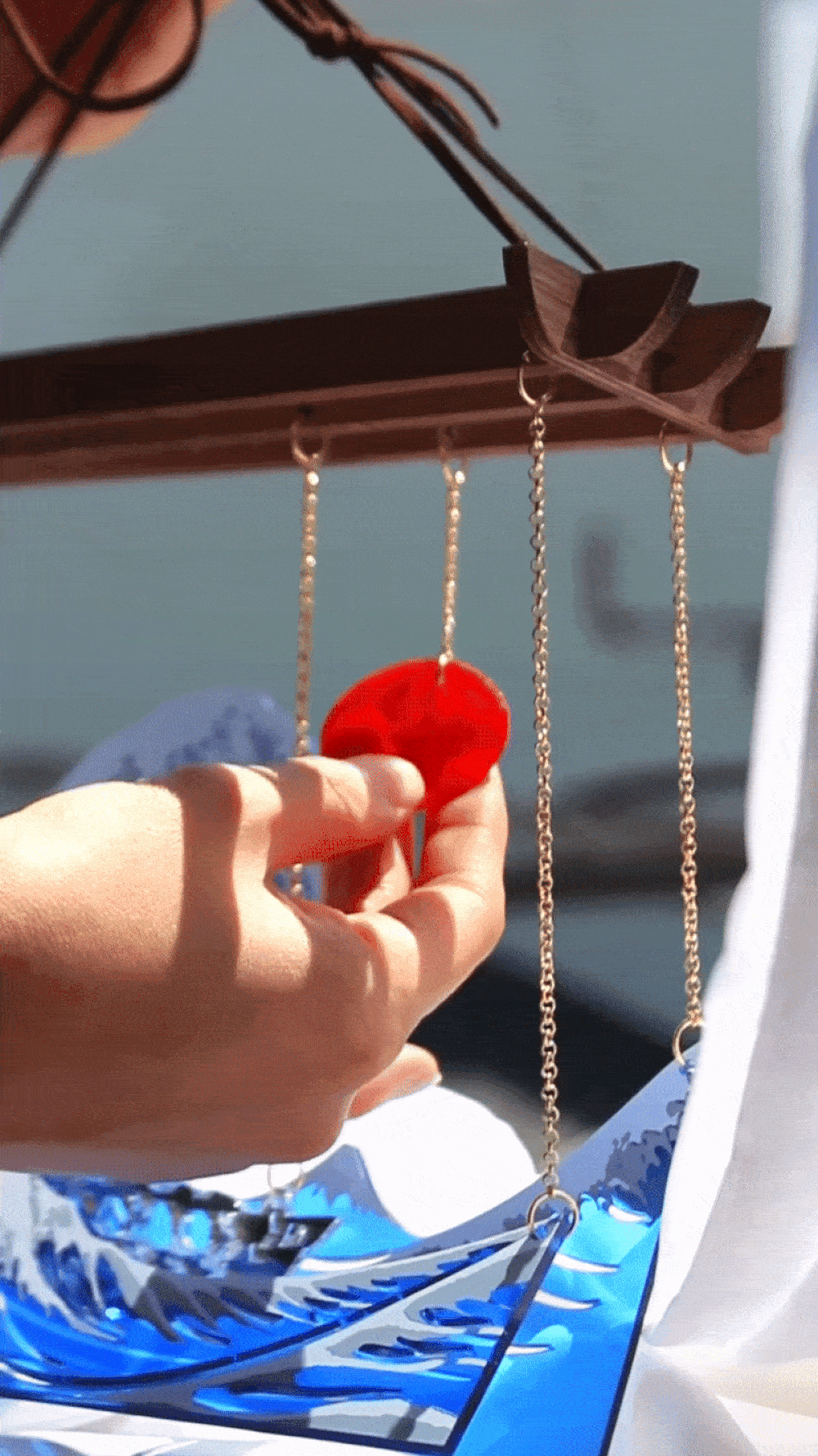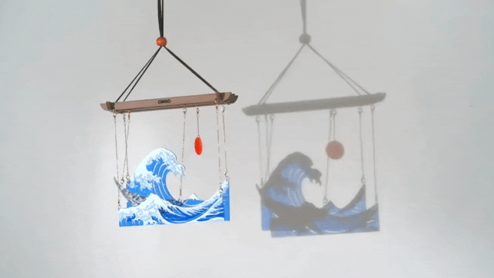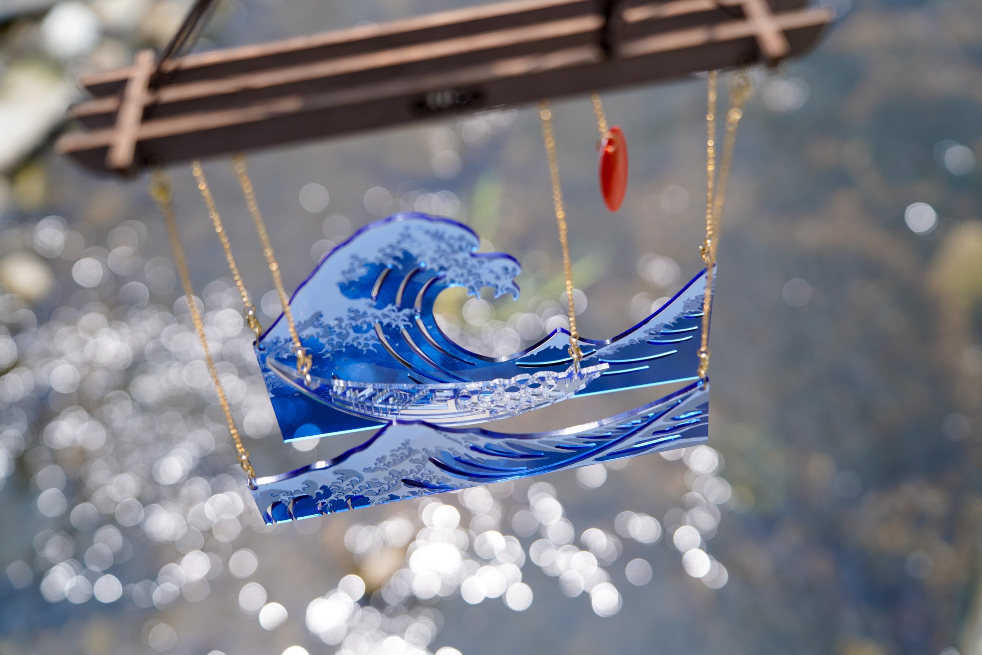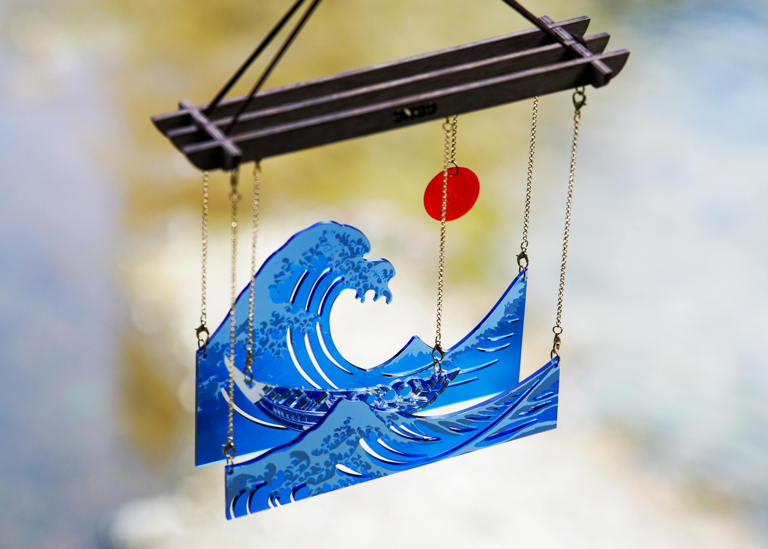 Stained Glass(ステンドグラス)の如く、太陽の光を透過して作品を表現するオブジェである「Sun Catcher(サンキャッチャー)」は、北斎が表現した神奈川の荒れた大波と、その波を克服する人々、そして富士山を空間に照らします。