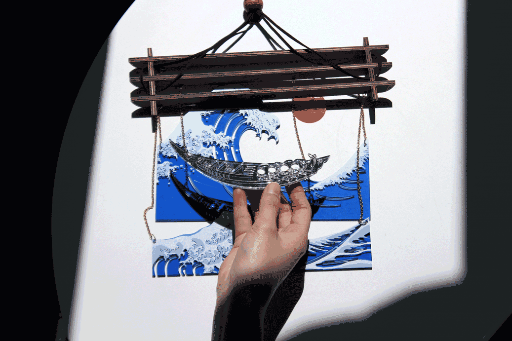 インテリアオブジェ(Objet)- 作品に込められたディテールを青いアクリル板をレーザーカットで繊細に切り取り、その上にシルクプリントで表現しました。それらを3段レイヤーでデザインし組み立てることで作品の立体的な魅力を活かしました。