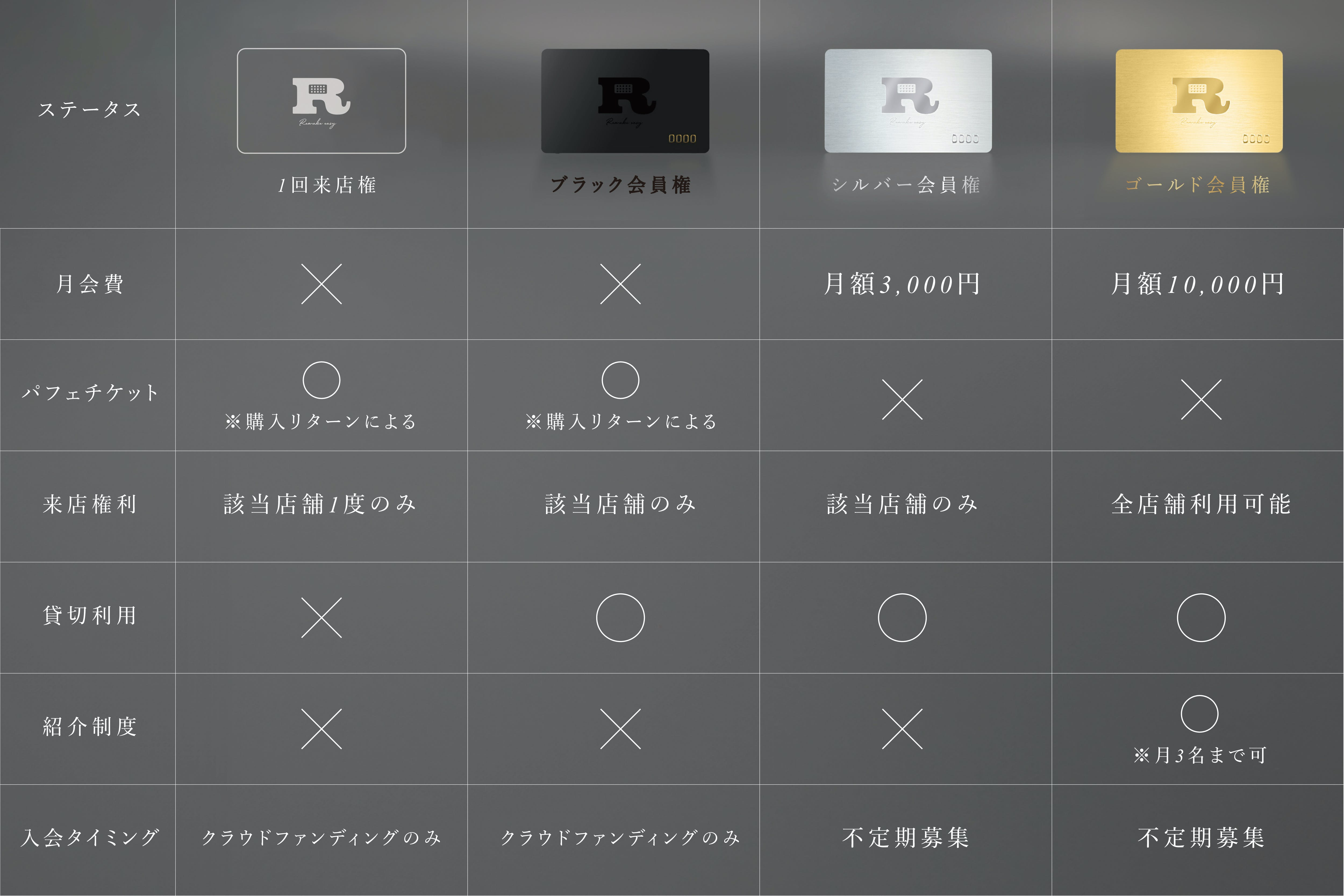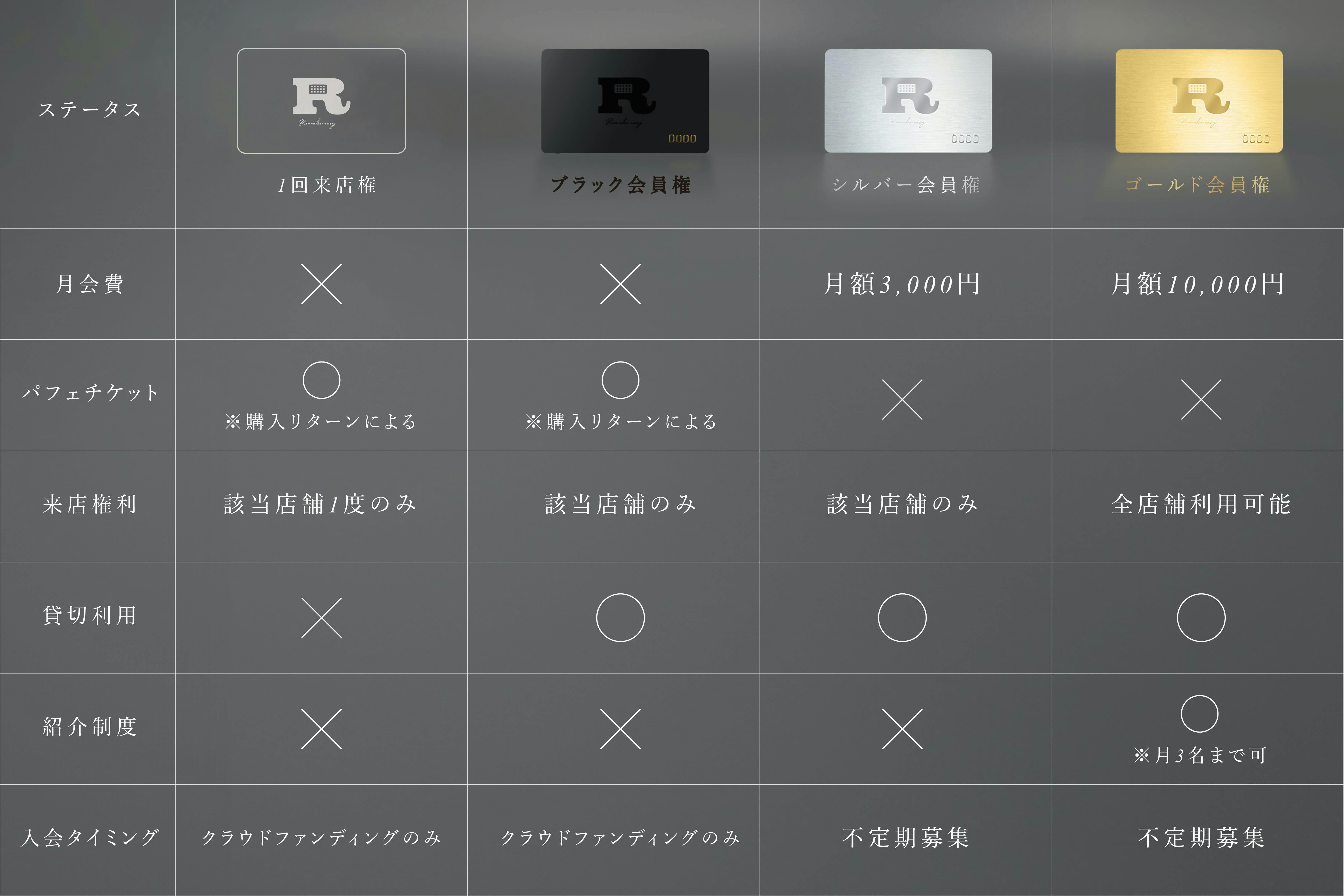 月額3,000円のシルバー会員権に加えクラウドファンディングでしか手に入れることができない年会費/月会費不要のブラック会員権と、Remake easyを1回体験することができる1回来店権をご用意させていただきました。