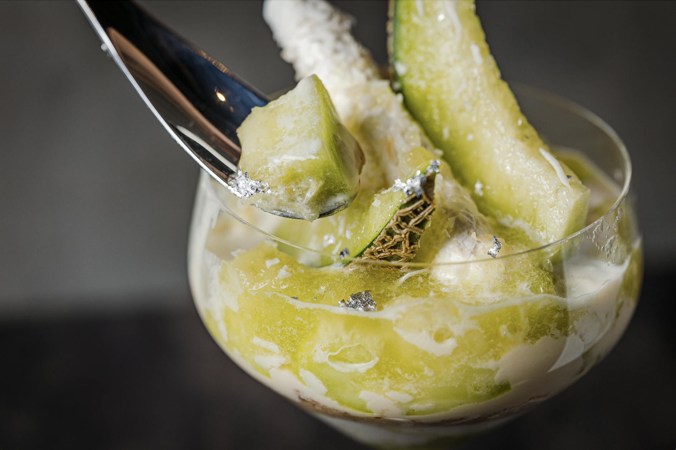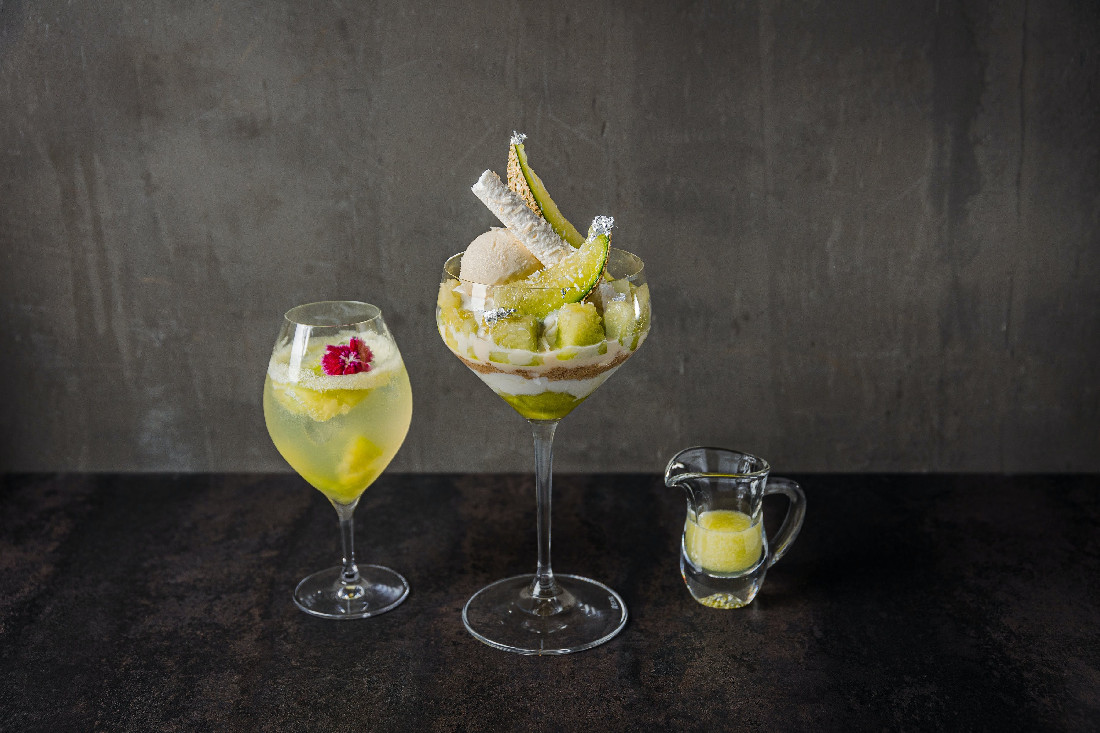 牧場直送のフロマージュブラン、北海道産の米を使用した日本酒とメロンがマリアージュした札幌店限定のパフェはラグジュアリーな味わいに。