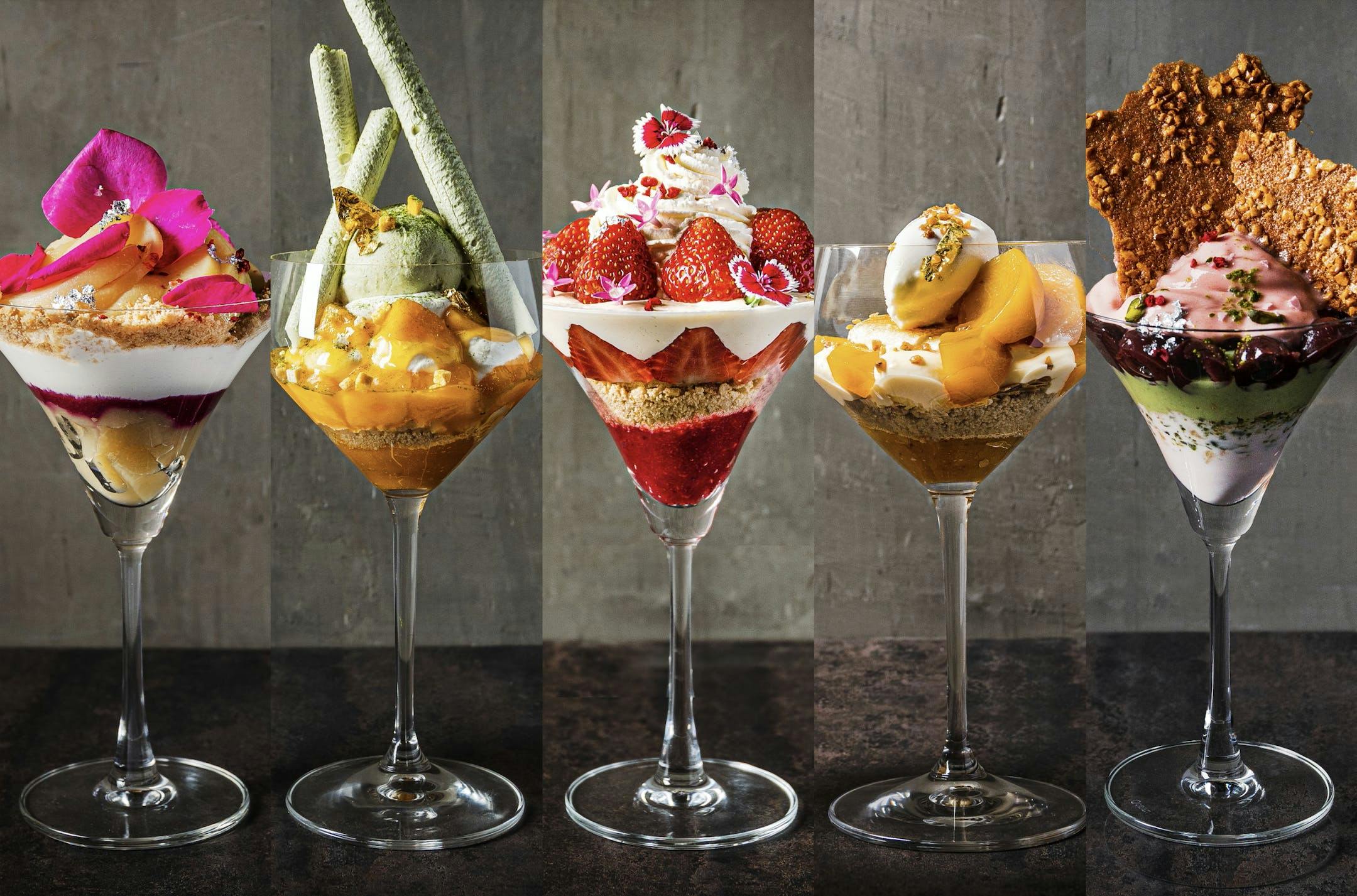 グラスの形状からスプーンの幅、運ばれるひとくちのバランスを1ミリ、1グラム単位まで計算することで、食べ進めていく楽しみがデザートに奥深さを与え、パフェをまるでアートに感じさせます。