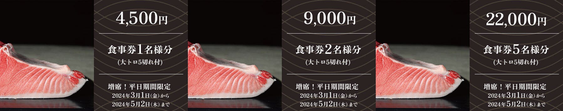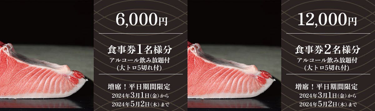 ◆増席!3月以降平日/13時以降限定 食事優待券+大トロ5切れ付き