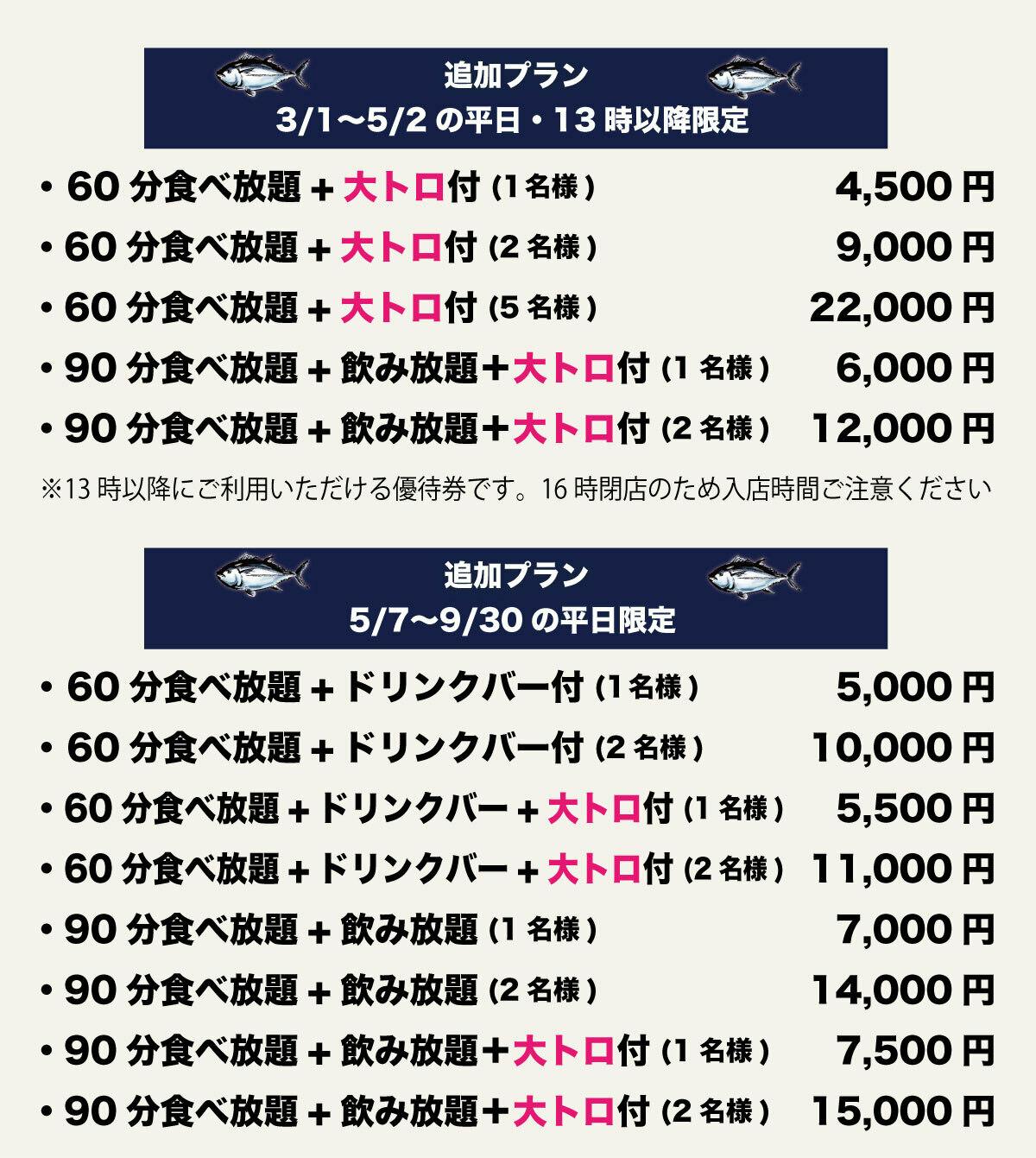 ◆増席!3月以降平日増席/13時以降限定 食事優待券 *アルコール飲み放題&90分延長プラン+大トロ5切れ付き