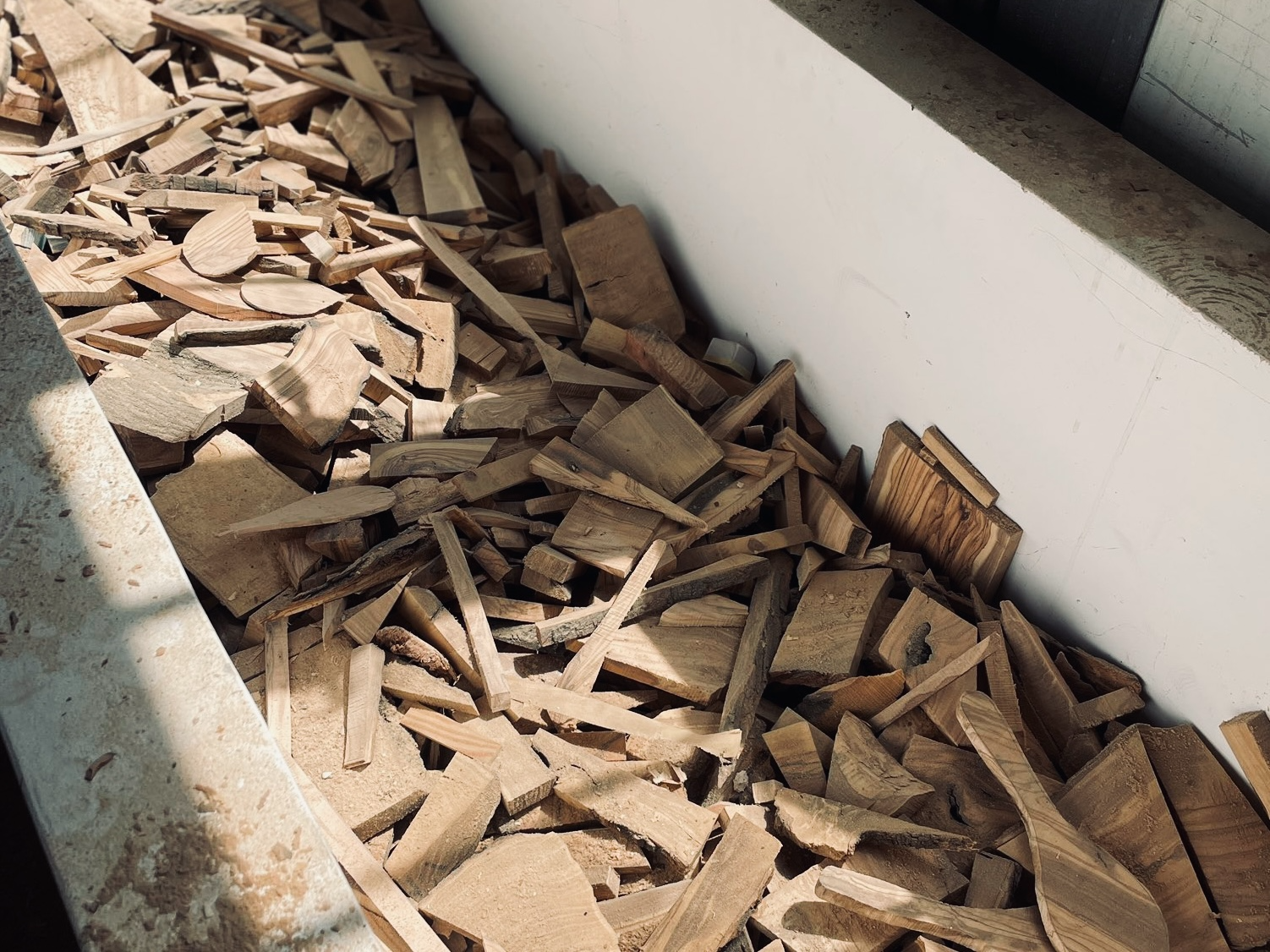 もったいないと思いつつも、使い道がわからず工房にたまっていくオリーブの木片たち。