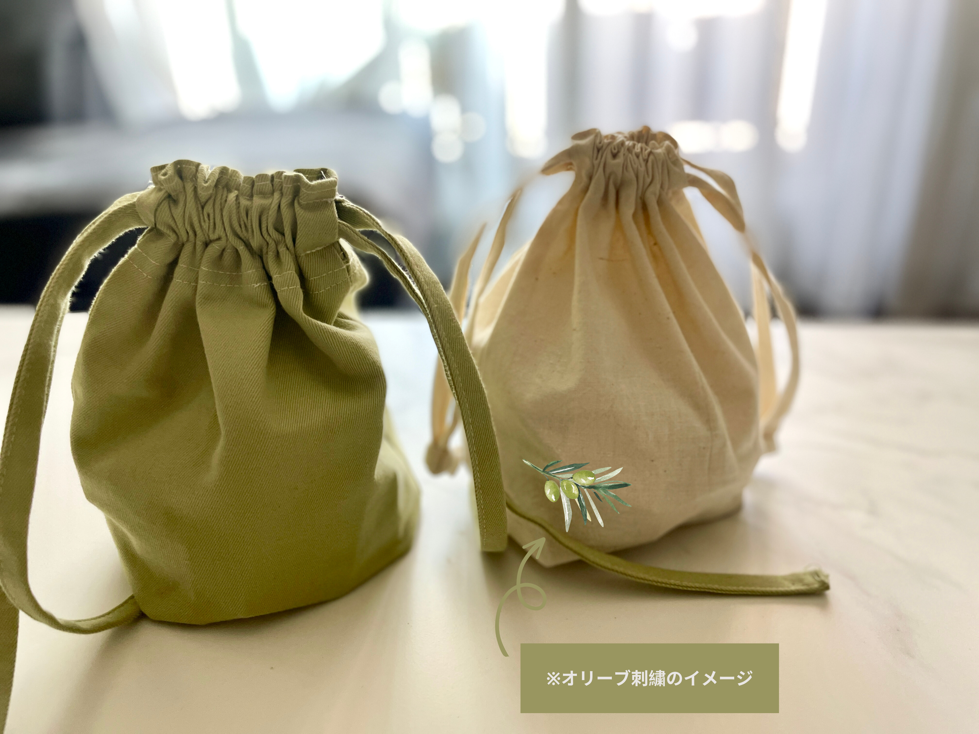 オリーブ色の巾着またはシリアのお母さんたちが手刺繍を入れた巾着が付きますので、お好みの方をお選びください。