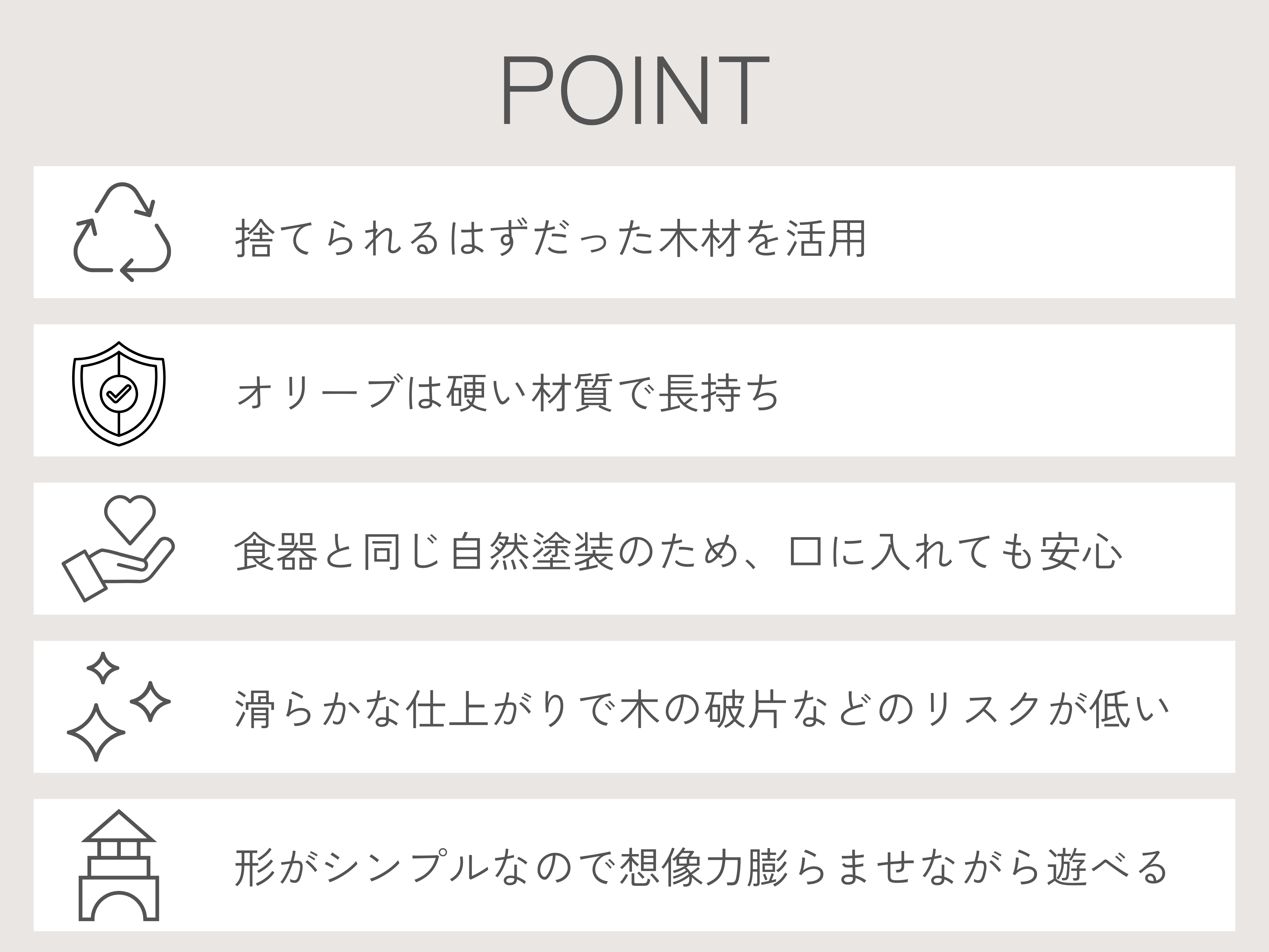 オリーブの木は、磨けば手触りもなめらかで、自然塗装のため小さいお子さんにも安心して触っていただけます。そしてオリーブの意味や花言葉は「平和」や「知恵」。