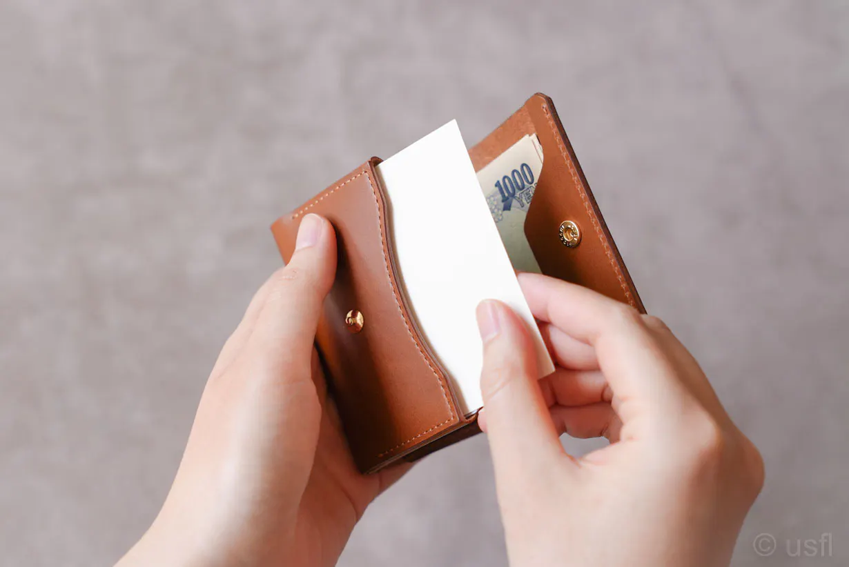 既存のコンパクト財布は、クレジットカードより大きなカードを収納できませんでした。名刺やショップカードをもらったときに、収納に困っていたはずです。