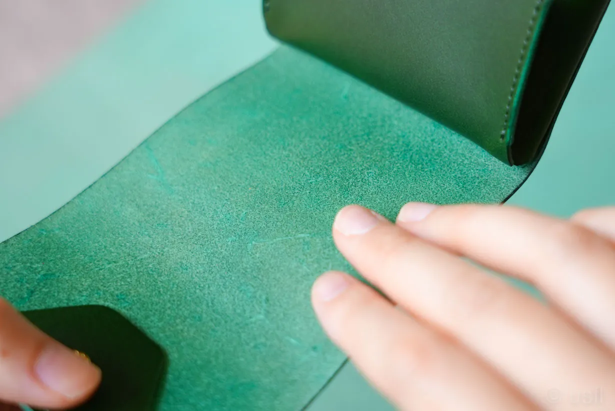 そこで、2枚のブッテーロを貼り合わせて、固さとコシを作り込んでいます(耐久性も向上します)。仕切りが動かしやすく、心地よく操作できます。コバもなめらかになり、手触りも良くなります。