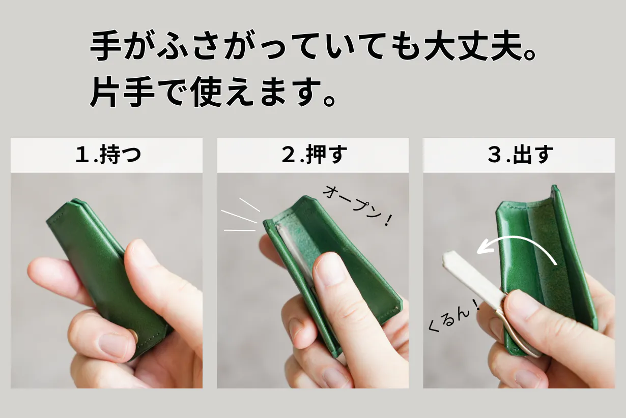 お金とカードを出し入れする順番が変わっても、財布を傾けたり、持ち替えたり、ポケットを開くアクションはありません。開いたポジションで、すべてをスムーズに出し入れできます。
