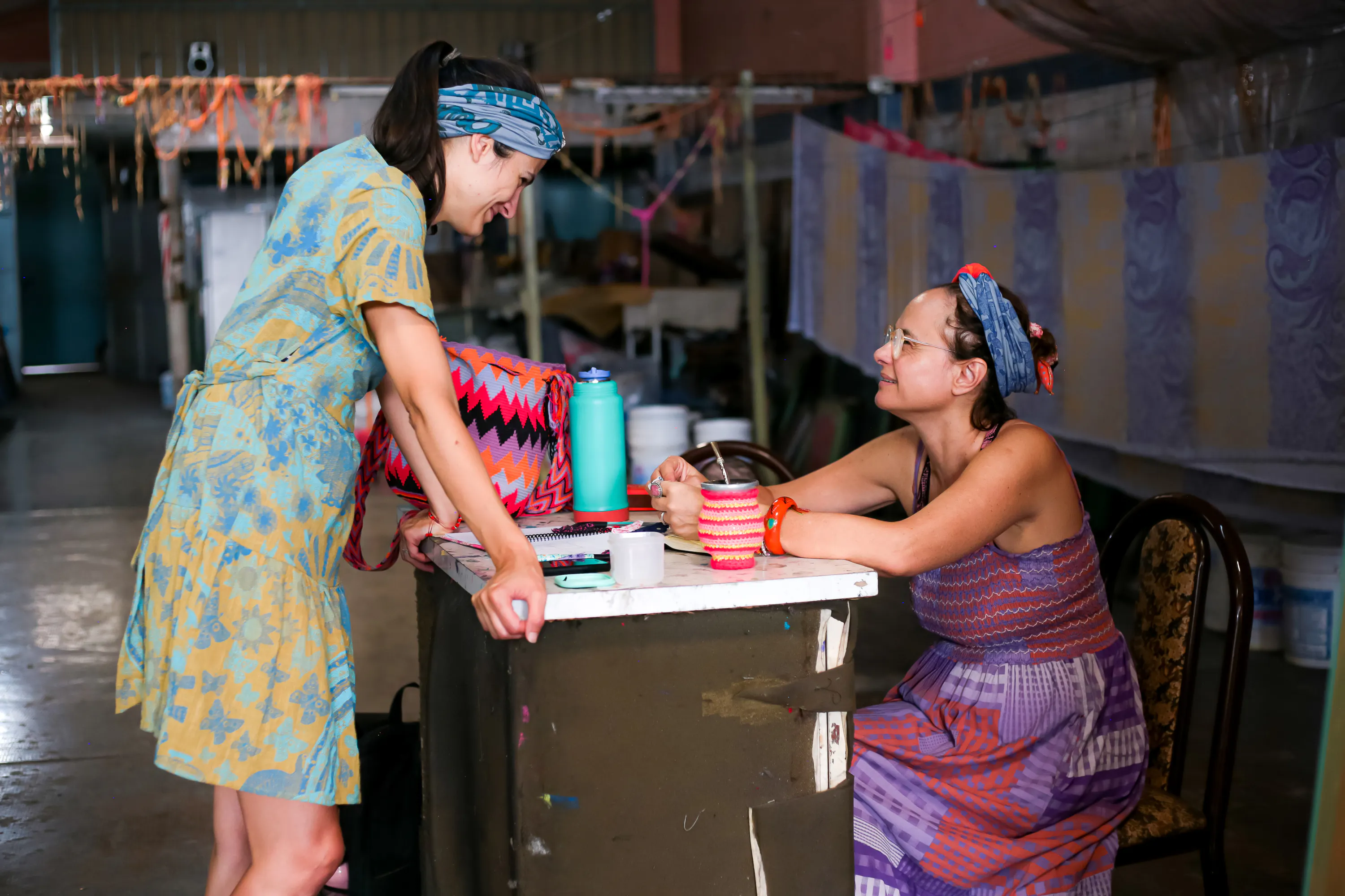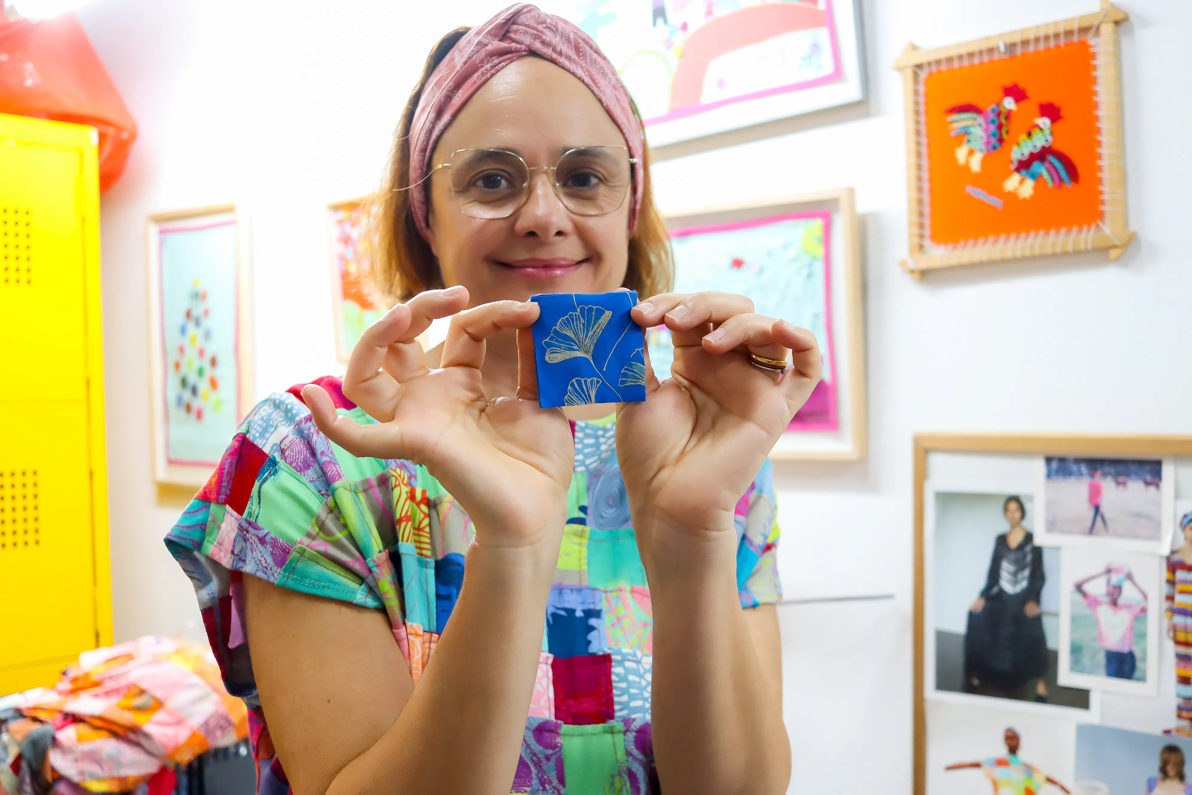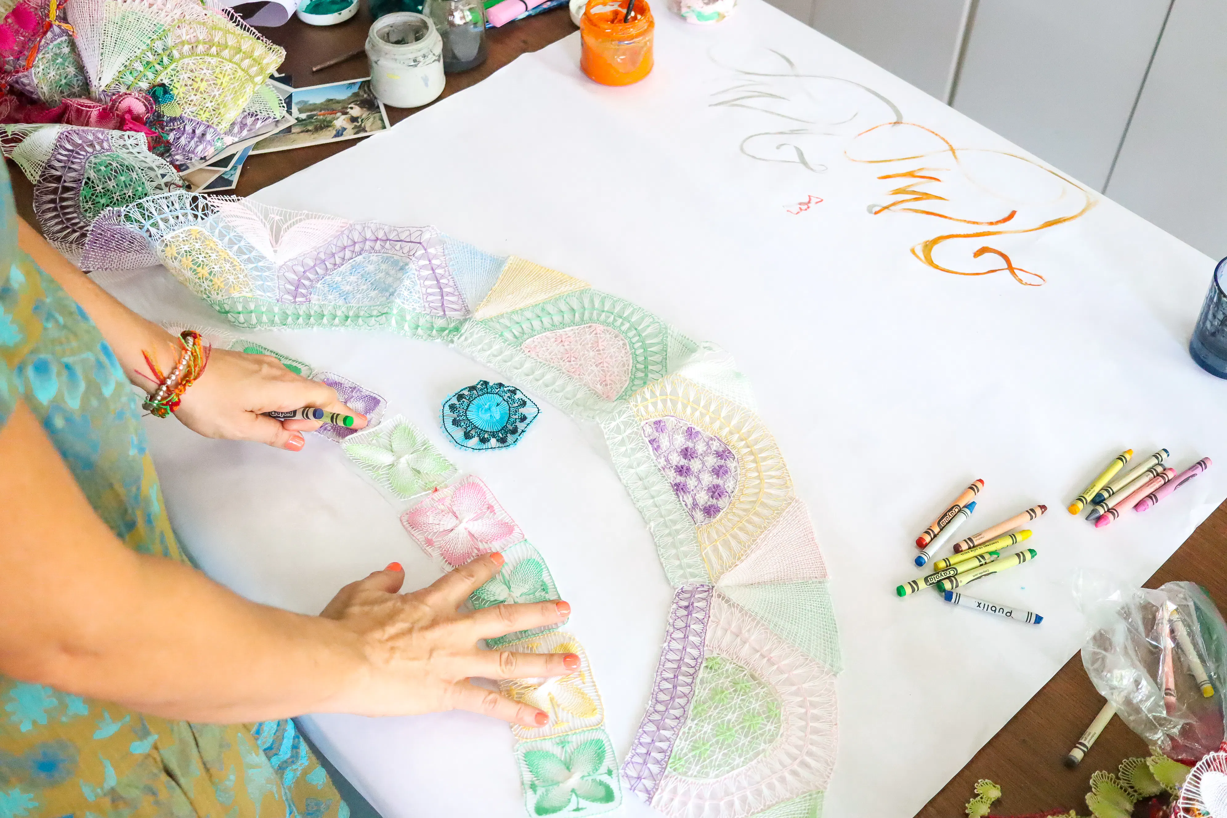 Juana de Arconの代表的なテキスタイルのモチーフであるニャンドゥティを並べて構想中のMariana。