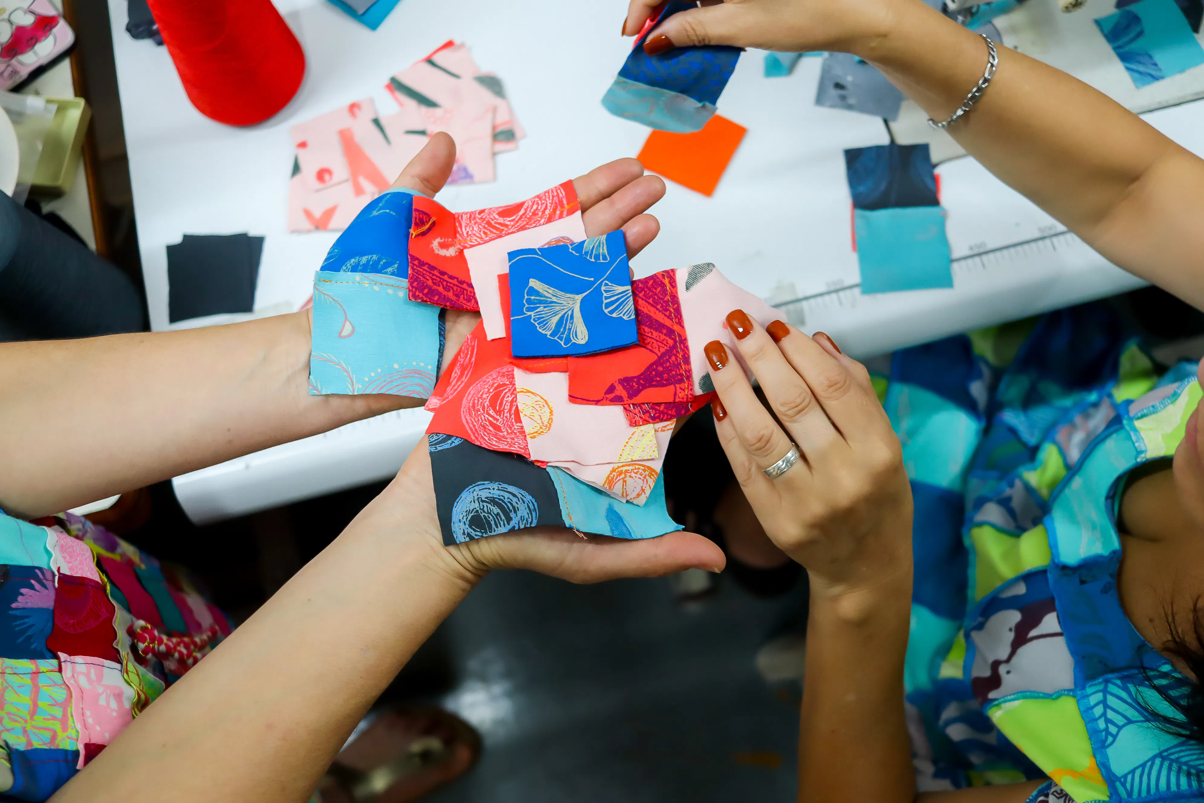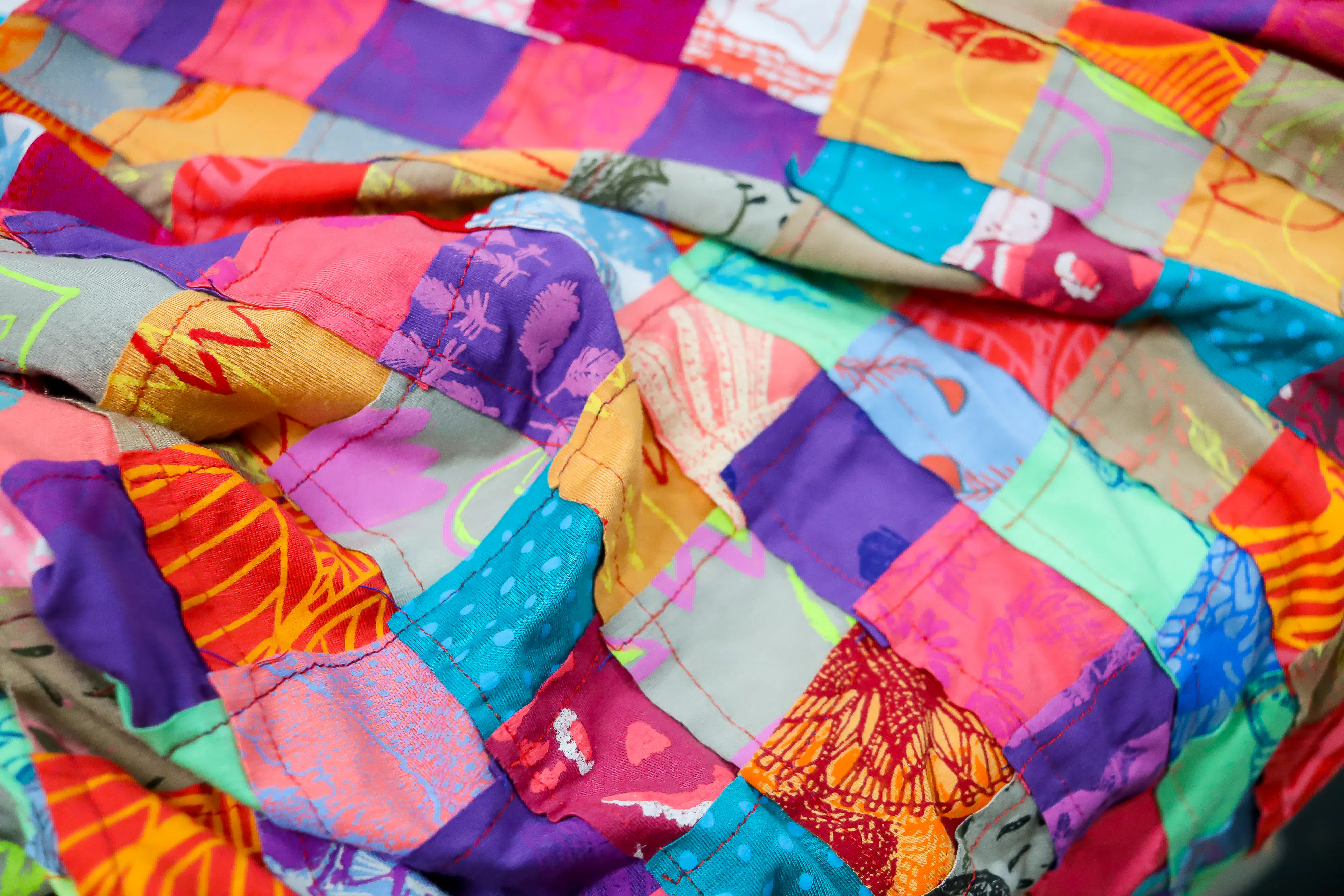 お洋服用にカッティングしたときに出た切れ端の布はパッチワークして新たな物語をつなぐ布にまた生まれ変わります