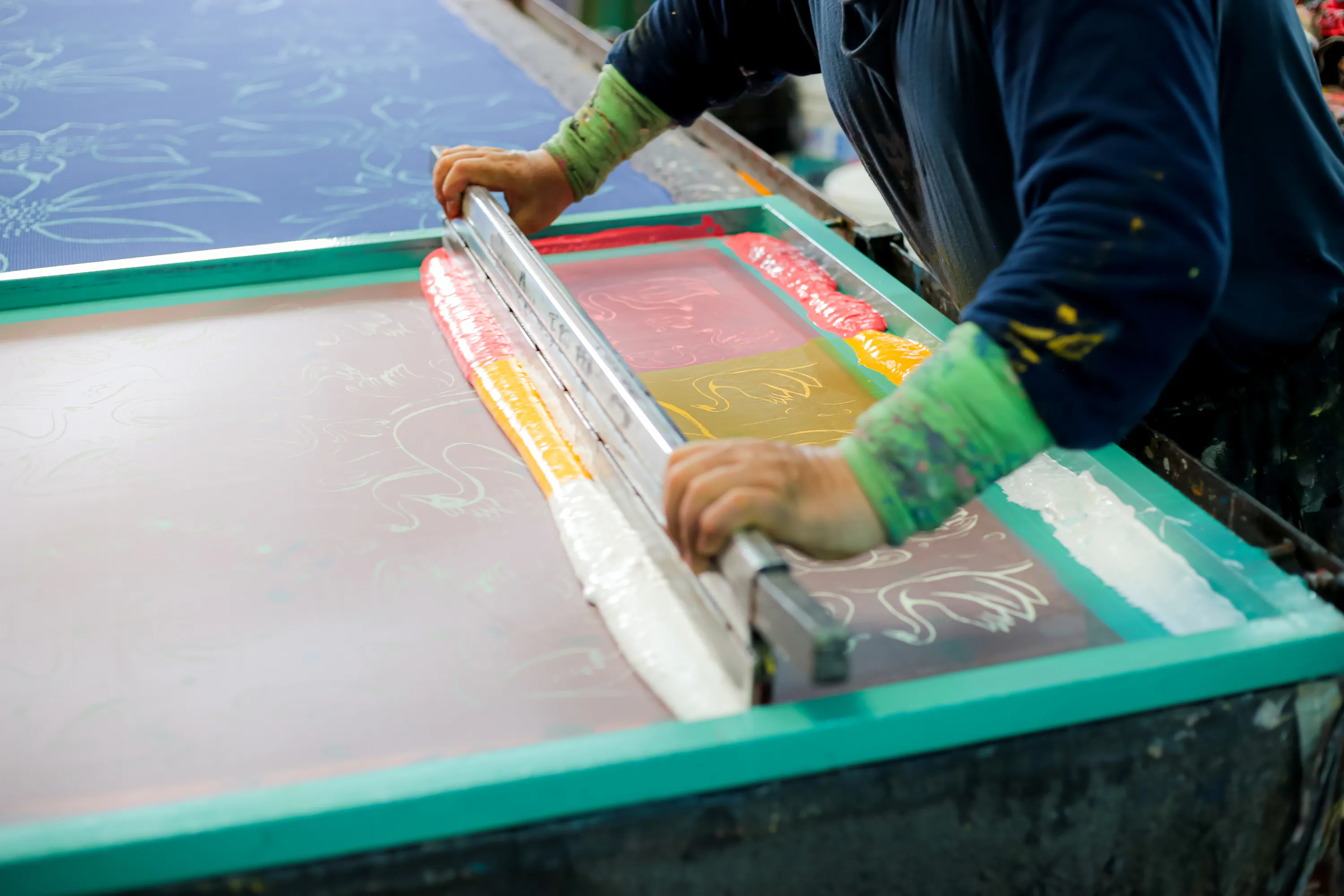 シルクスクリーンにてハンドメイドで柄をプリントしていきます。