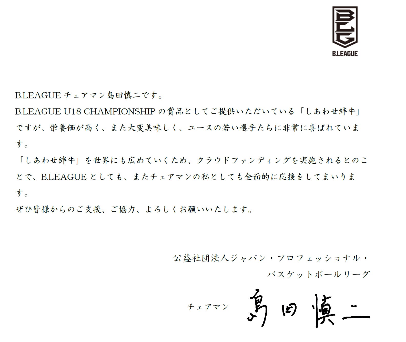 ②B.LEAGUE U18 CHAMPIONSHIPへ、しあわせ絆牛を副賞として提供
