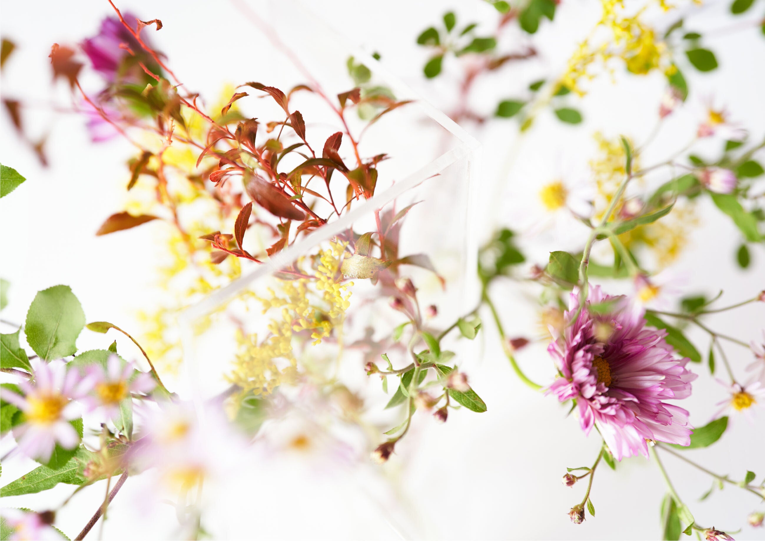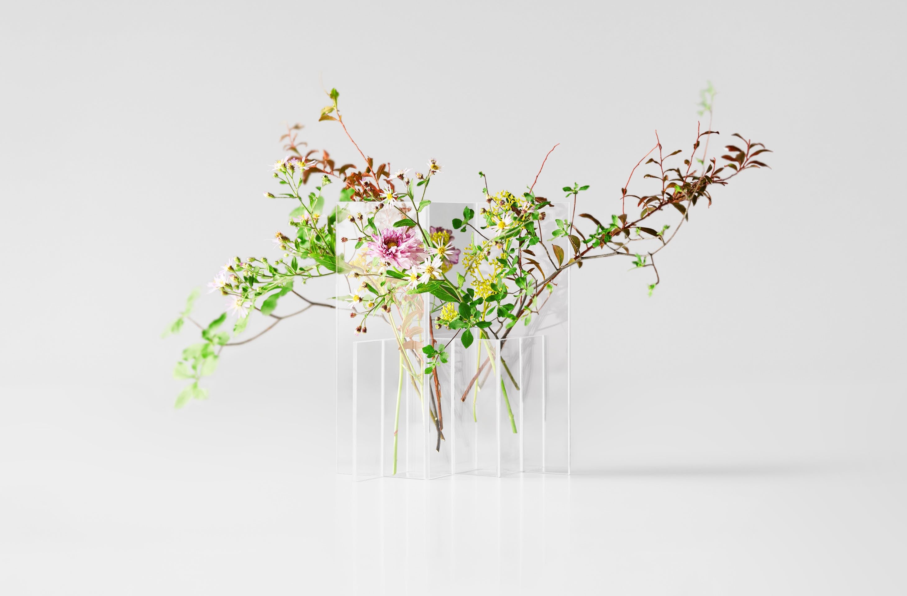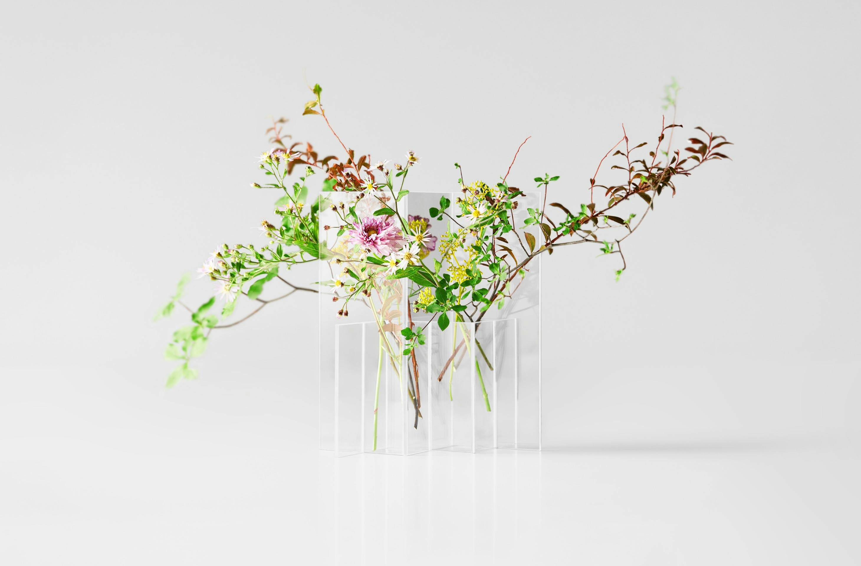 「しきりんざし」は一輪挿しとしても使うことができますが、両面に花を挿して使用いただくことも可能です。屏風のような形状は花を複雑に反射し、手前に見える花と奥に挿された花、そして反射した花が重なり合うことで、豊かな表情を見せてくれます。