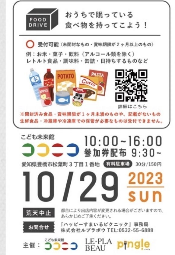 「ハッピースマイルピクニック」内にて、「フードドライブ」のブースを設けて不要な食品の引き取りを行います!