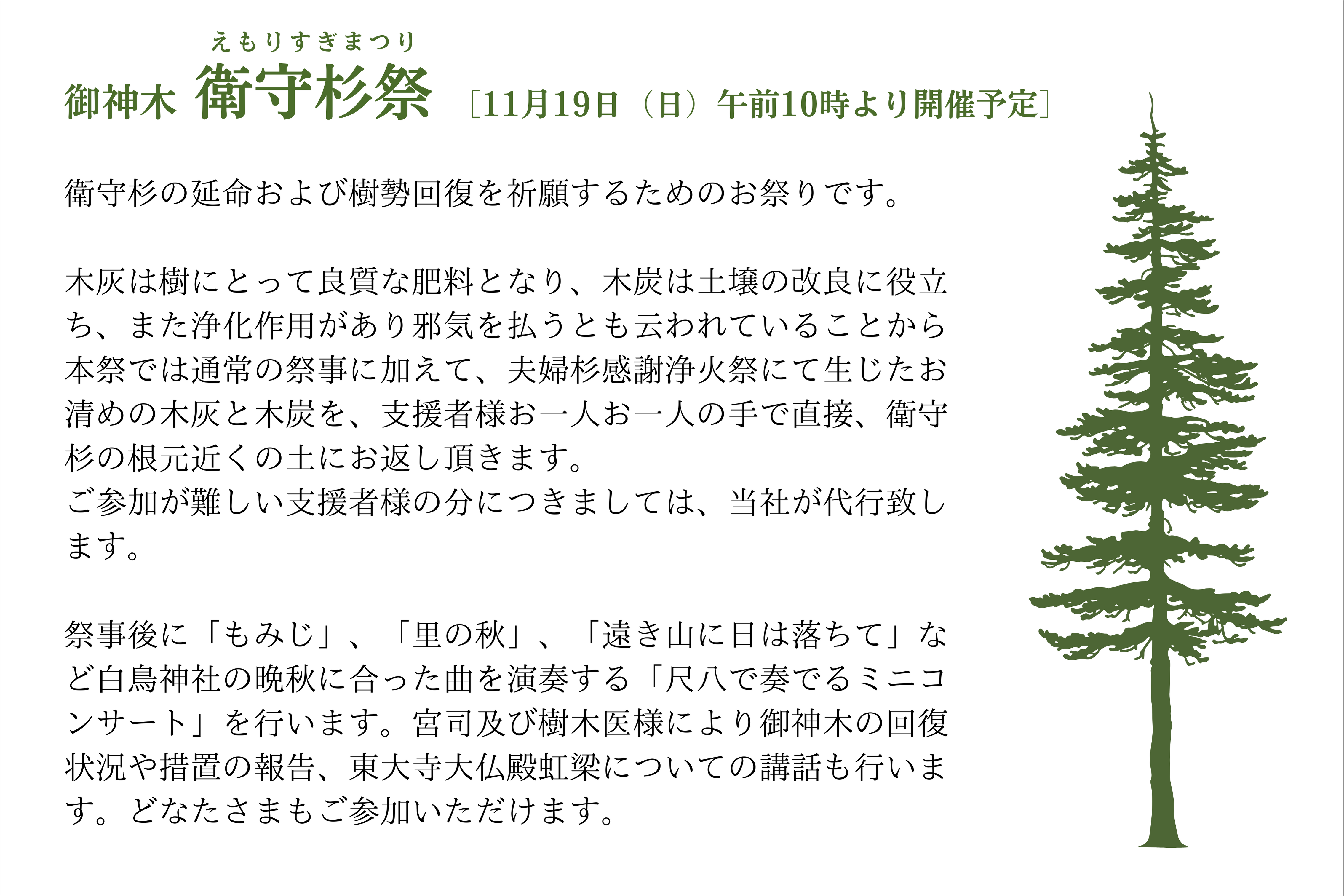 『夫婦杉感謝浄火祭』と『御神木 衛守杉祭』の二つの祭儀を執り行います。どなたでもご参列可能です。