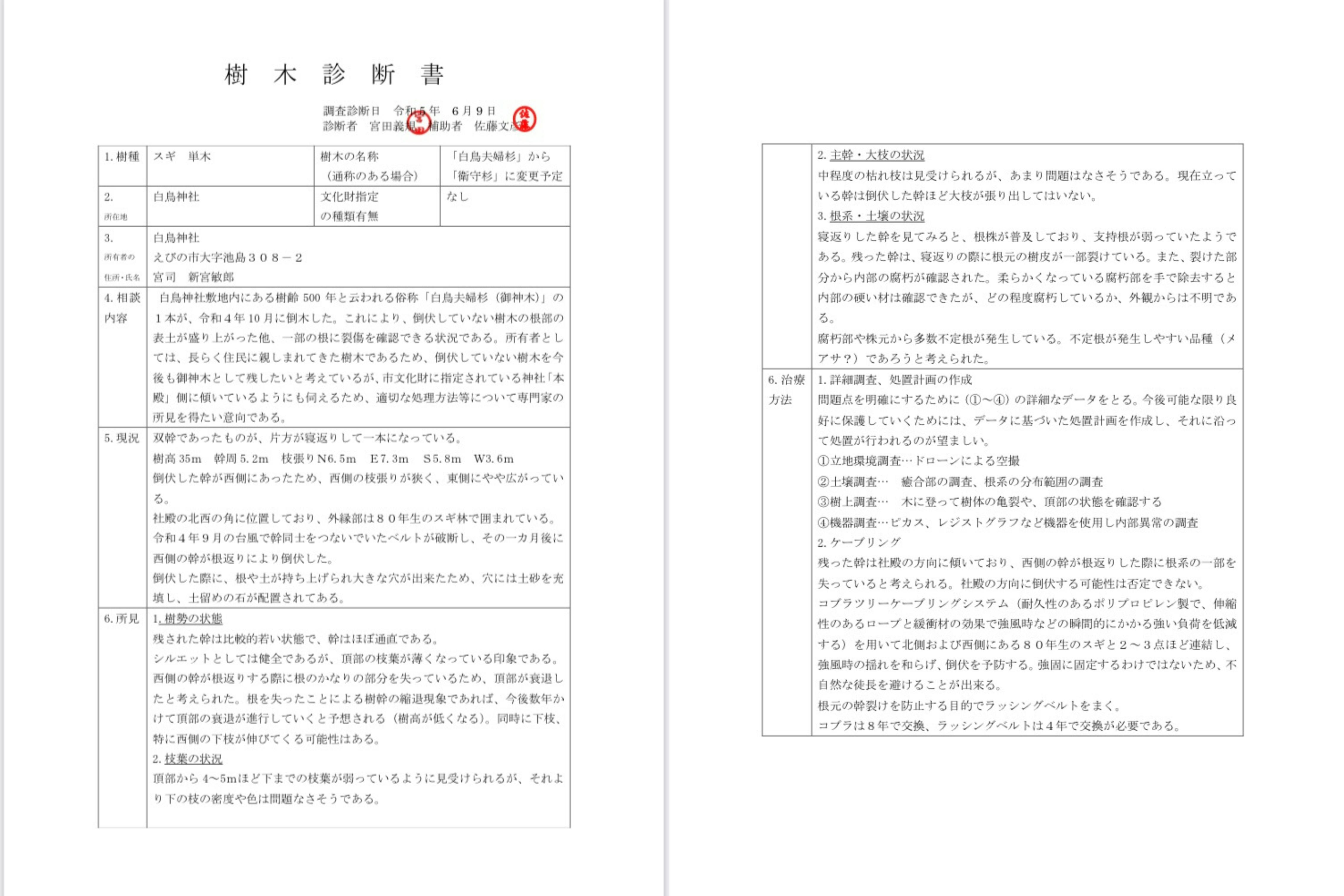 樹木医の宮田さんに精密な樹木診断をお願いしました。その時の診断書がこちらになります。