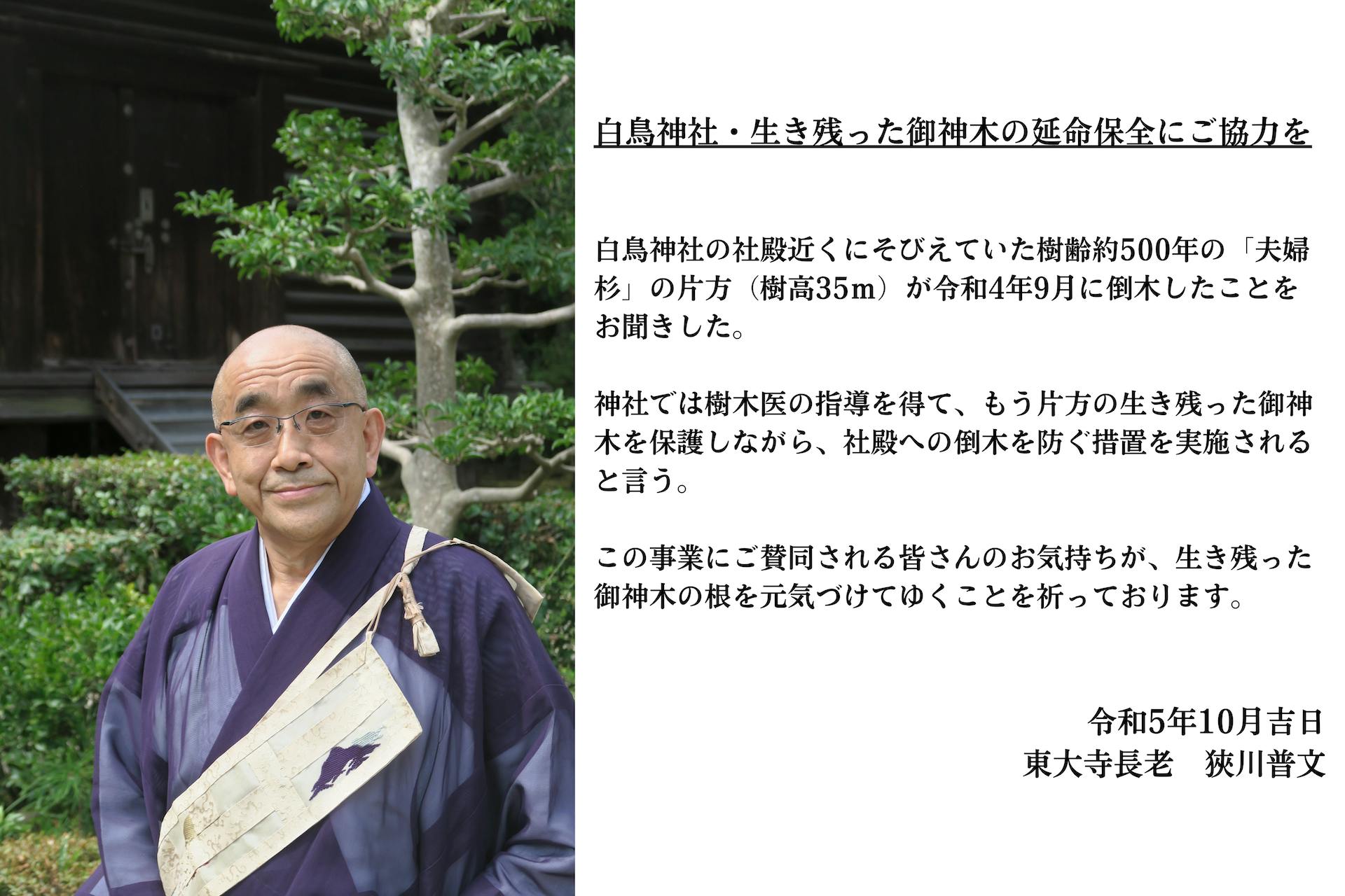 “「夫婦」と呼ばれた神木の片側が、倒伏した後も同じ場所に逞しく佇み続けるこの姿は、パートナーや大切な人を無くされた方々にとっても心の支え、心の拠り所にふさわしいので長く守ってほしい”