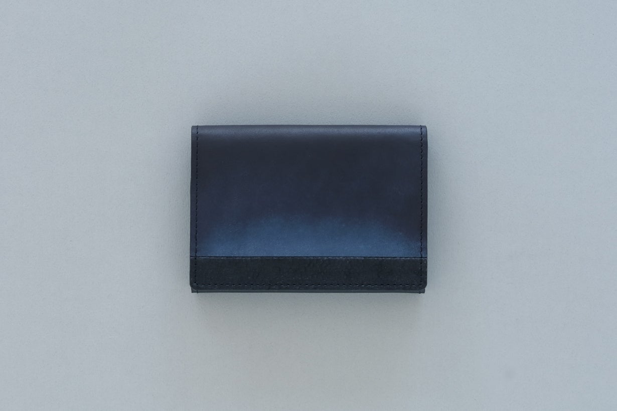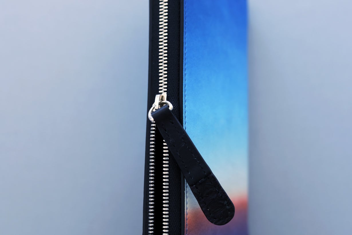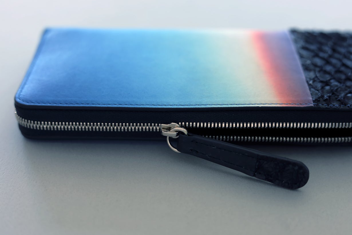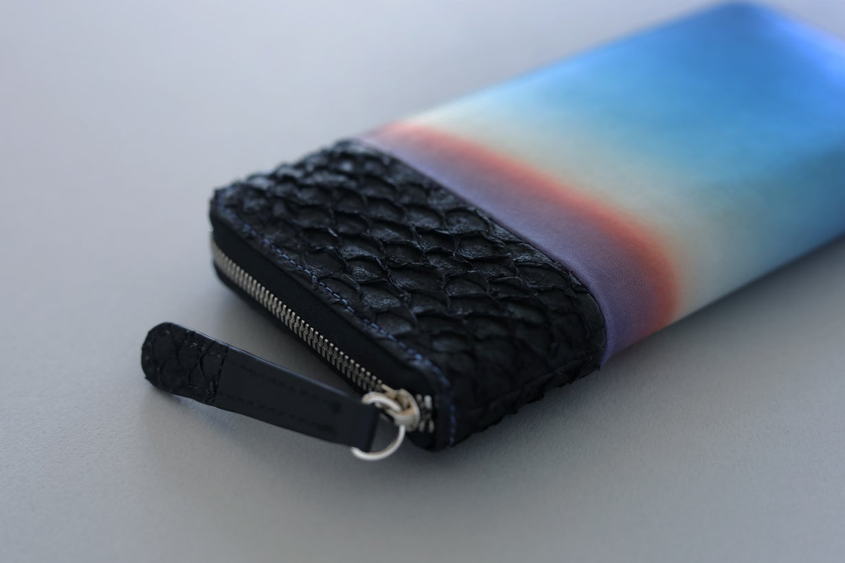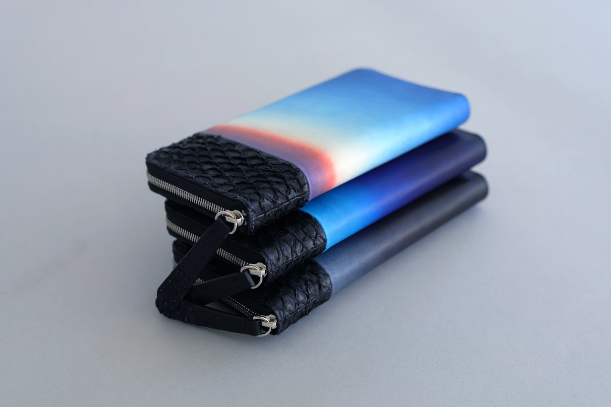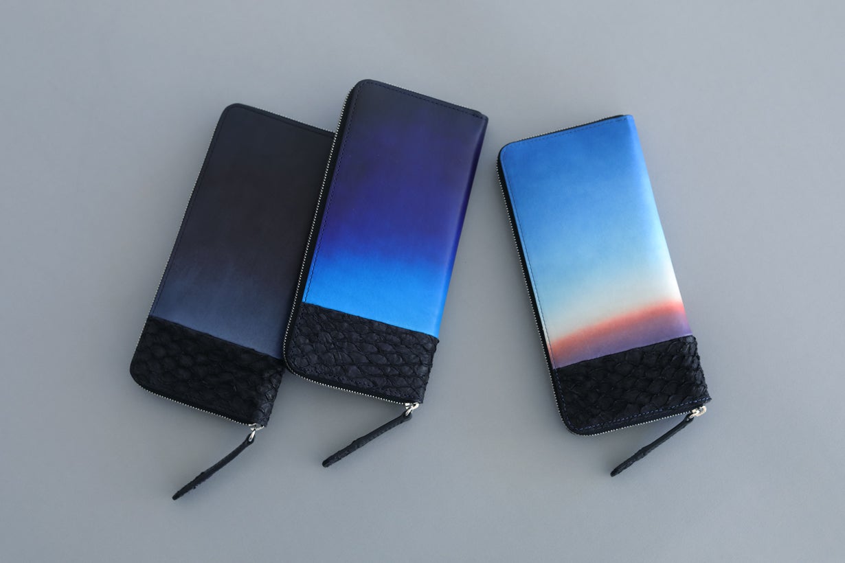フィッシュレザーの鱗模様を「海の波」に見立て、グラデーションレザーを「変わりゆく空」に見立て、美しい風景をそのままお財布に。