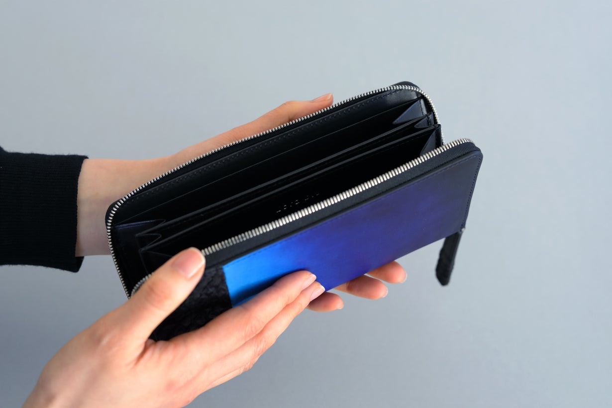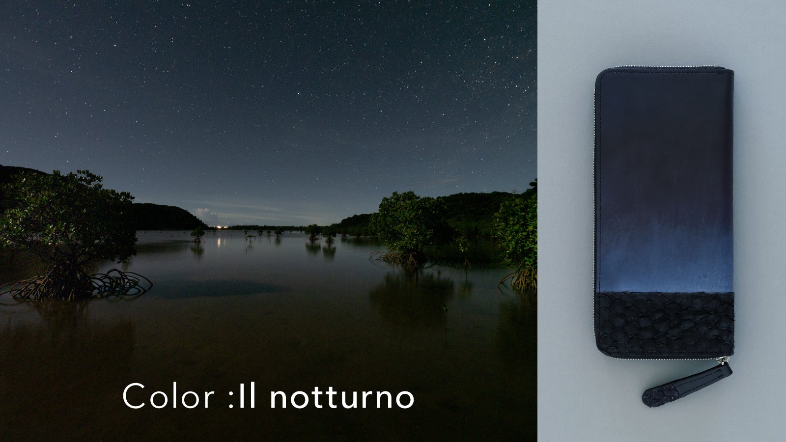 財布をキャンバスに見立て、夜の海を描きました。美しいグラデーションに仕上がるまで、何度も試作を重ねてようやく納得のいく色に仕上がりました。