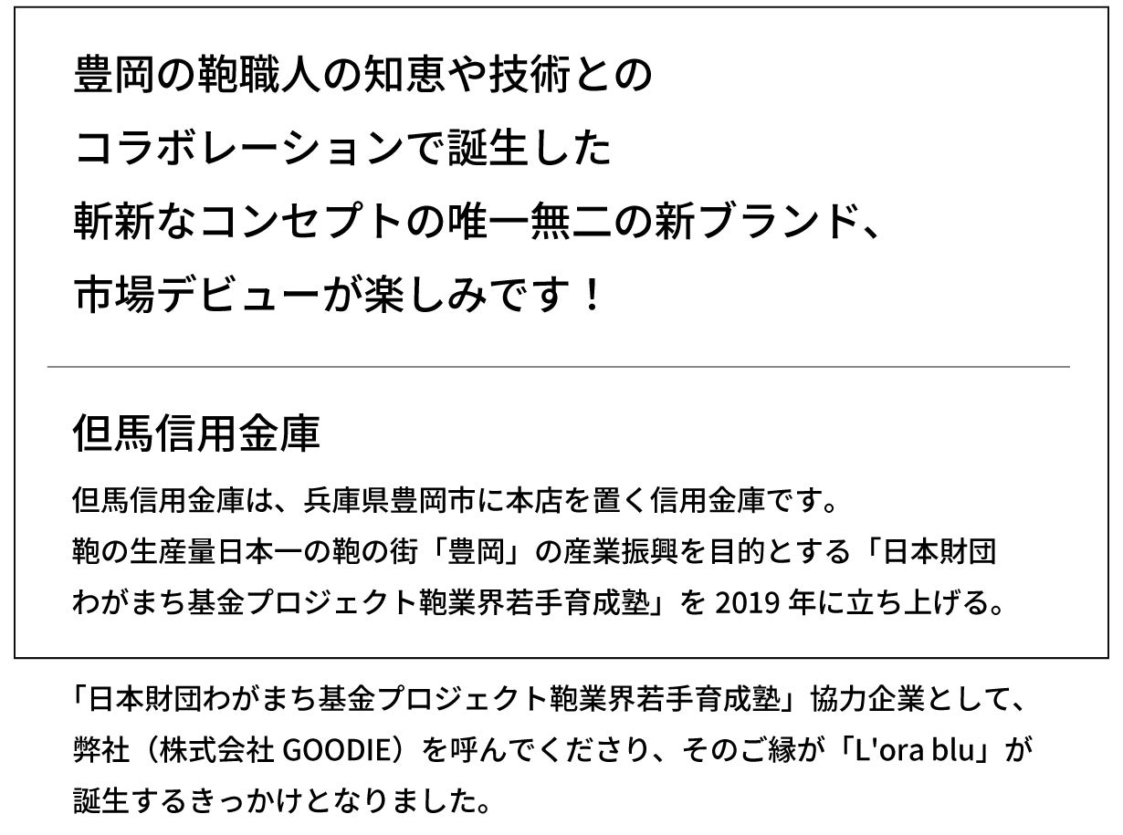 フィッシュレザー・姫路レザー(国産レザー)による「生命の恵みを無駄にしない持続可能なものづくり」と、ご縁をいただいた兵庫県豊岡市の「鞄産業」「財布」の振興に少しでも力になれればという想いからスタートしたプロジェクト。