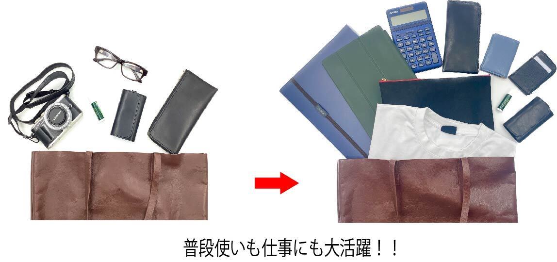 今回は、重く見えがちなレザートートバッグを気軽にサクッと持って頂きたいなという思いと、仕事用〜普段使い、折り畳んでお買い物や旅行用のサブバッグと様々な場面を想定して『軽ふわレザートート』を製作しました。