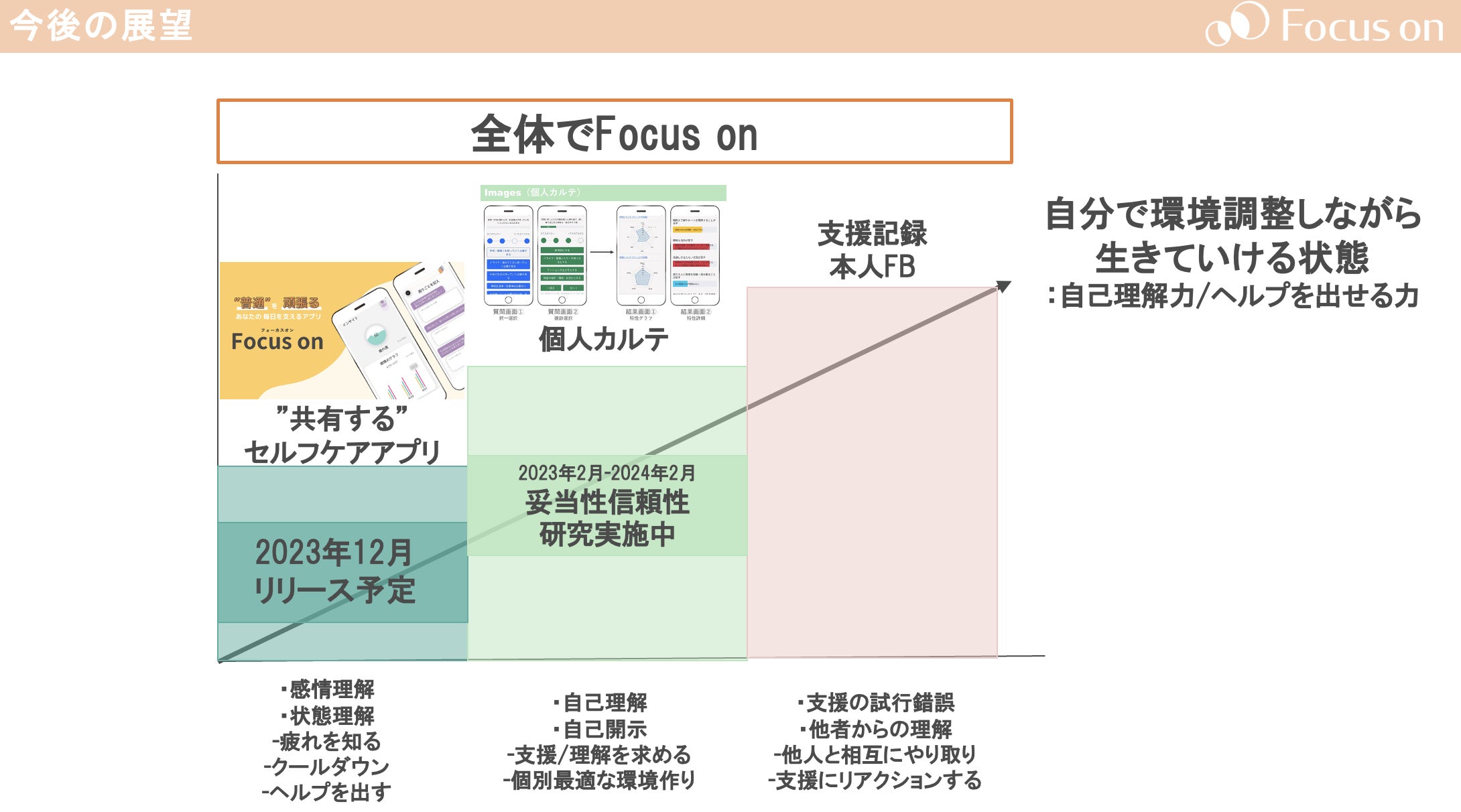実際、Focus on α版では、発達障害の有無にかかわらず、様々な困り事を持つ学生さんが使ってくれていました。そして、「疲れに気づけた!」「生活の中で休むラインが引けた!」と嬉しい感想もいただきました。そのため、本アプリは高校生の立案時代から紆余曲折あり、現在は「”普通”を頑張る人たち/目に見えない困難や特性を持つ方向け」の”共有する”セルフケアアプリとして開発を続けています。