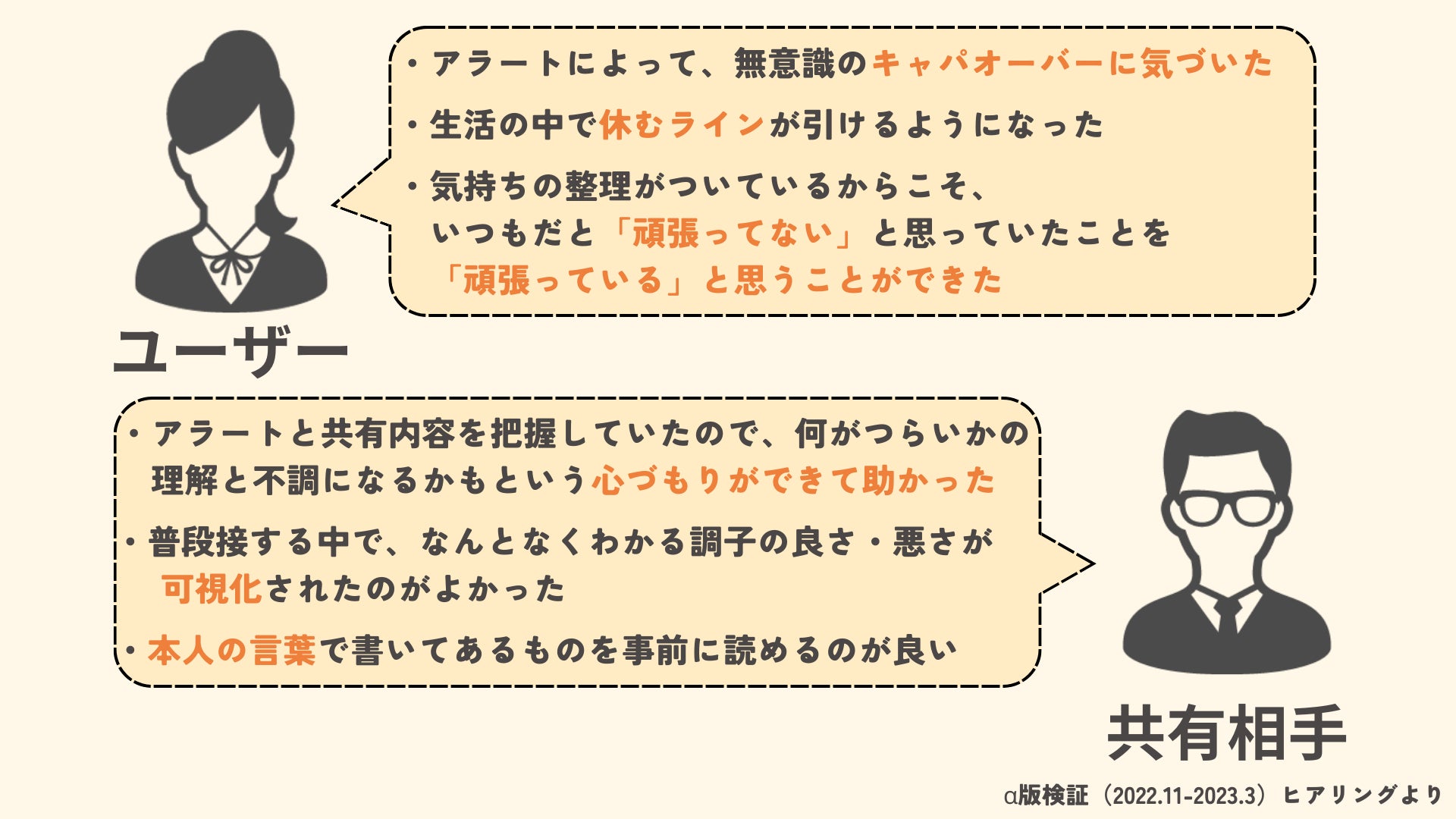 本人から見える世界や感覚をベースに疲れ度を可視化したり、困り事等を共有することによって、本人なりの頑張りや見た目ではわからない”大変さ”について伝える/知ることができます。2023年12月のリリースを目指して、2022年末から2023年初めにかけてα版検証、現在(2023年9月~11月末)β版検証を行っています。