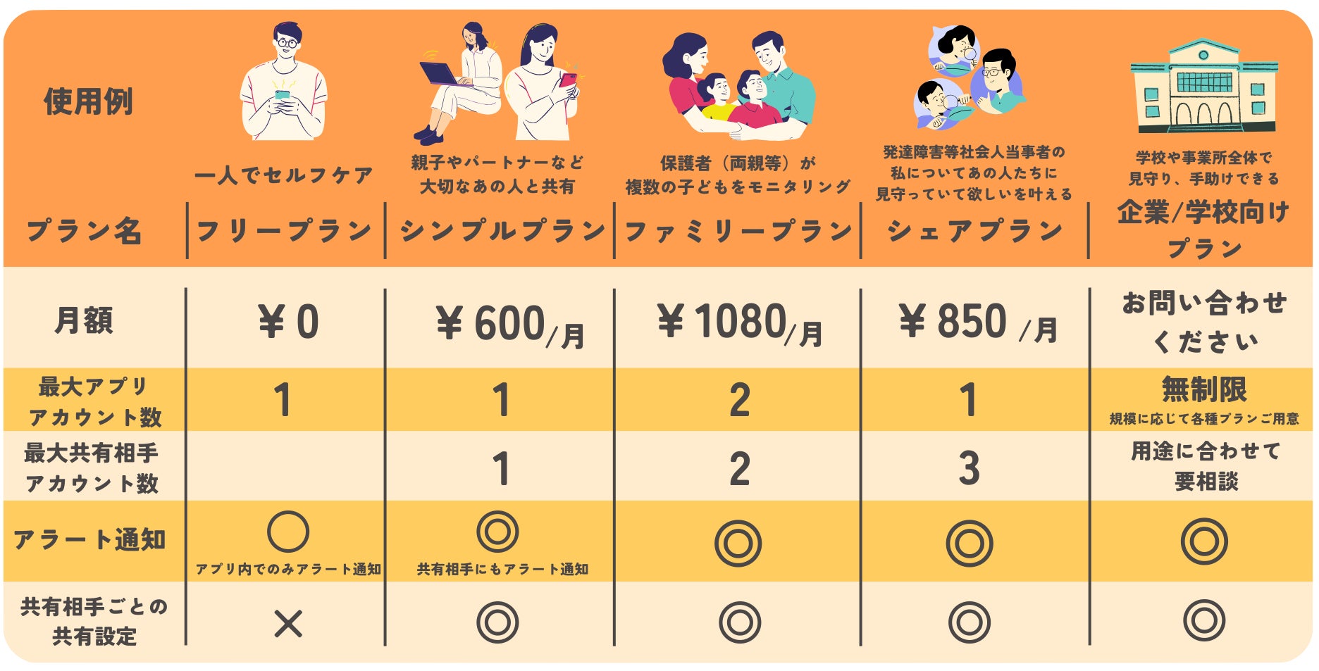 アプリユーザーのみで使用する場合、他のセルフケアアプリ同様、基本的に無料でご利用いただけます。