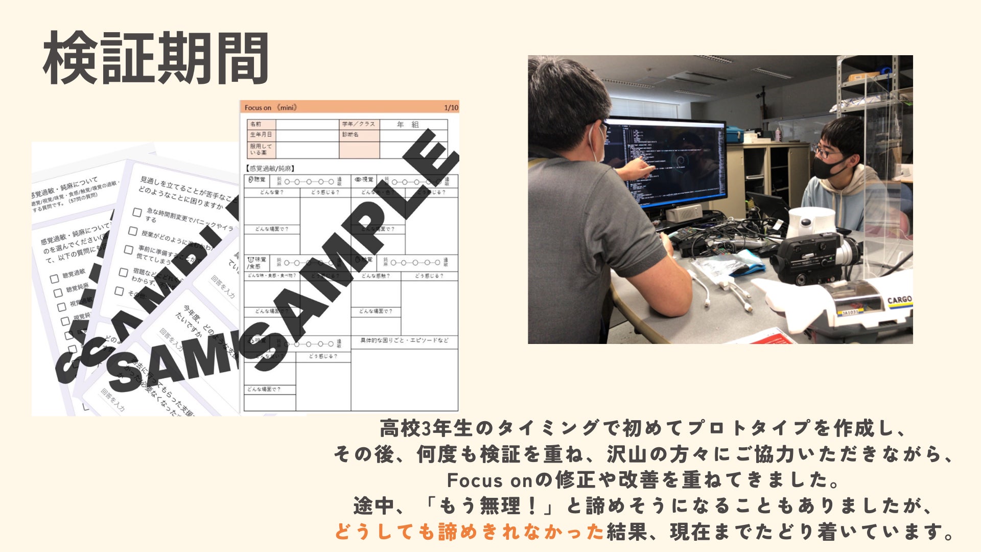 Focus onは、代表の森本自身が通常学級に在籍していた発達障害の当事者であり、小中で不登校を2回経験する中で、社会や学校と関わり続けたいのに、それが難しく、苦しい思いをしている方やその周囲の方が、頼れるツールを作りたいと考え、開発を始めたものになります。