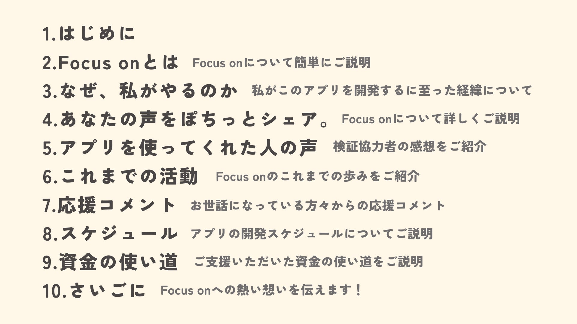 そう考えるようになり、「自分が現状を変えるために出来ること」ひいては、「私の見ている世界を周囲に覗いてもらえる未来」を作るために、アプリFocus onを立案しました。