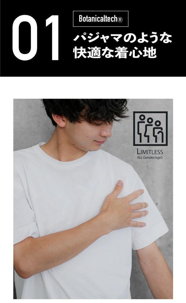Tシャツは皆さんたくさんお持ちだと思いますが、Botanicaltech®の独特の着心地を楽しんでいただき、是非「お気に入りの一枚」としてクローゼットに入れていただけると幸いです。