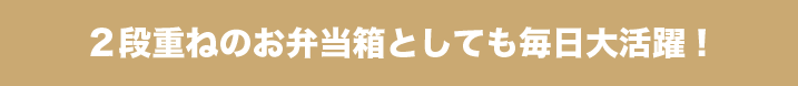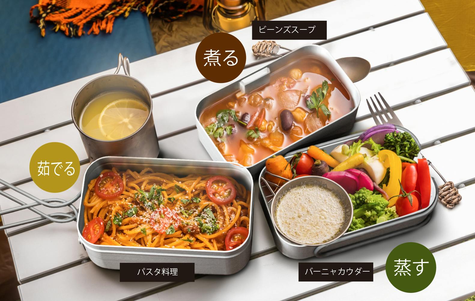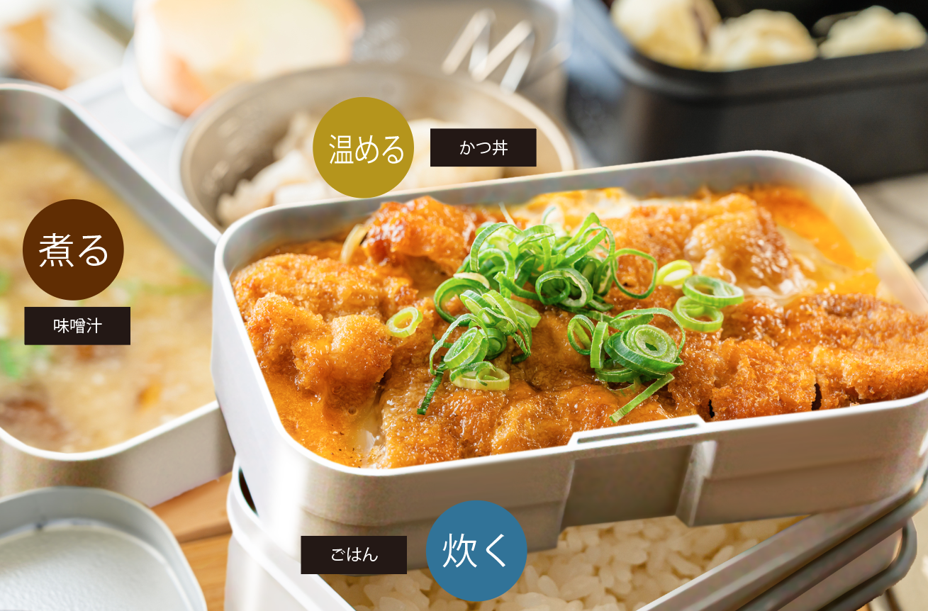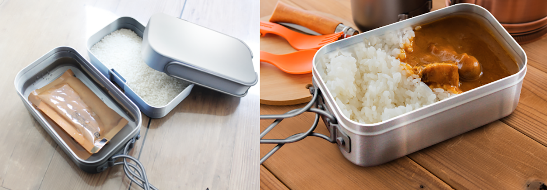 2層式のお弁当箱として、キャンプ用クッカーとしてだけでなく、普段使いでも大活躍!!本体にご飯とおかず。中蓋にさらにおかずまたはデザートやサラダといった副菜を分けて入れられる便利なランチBOXに。毎日がキャンプ気分に!