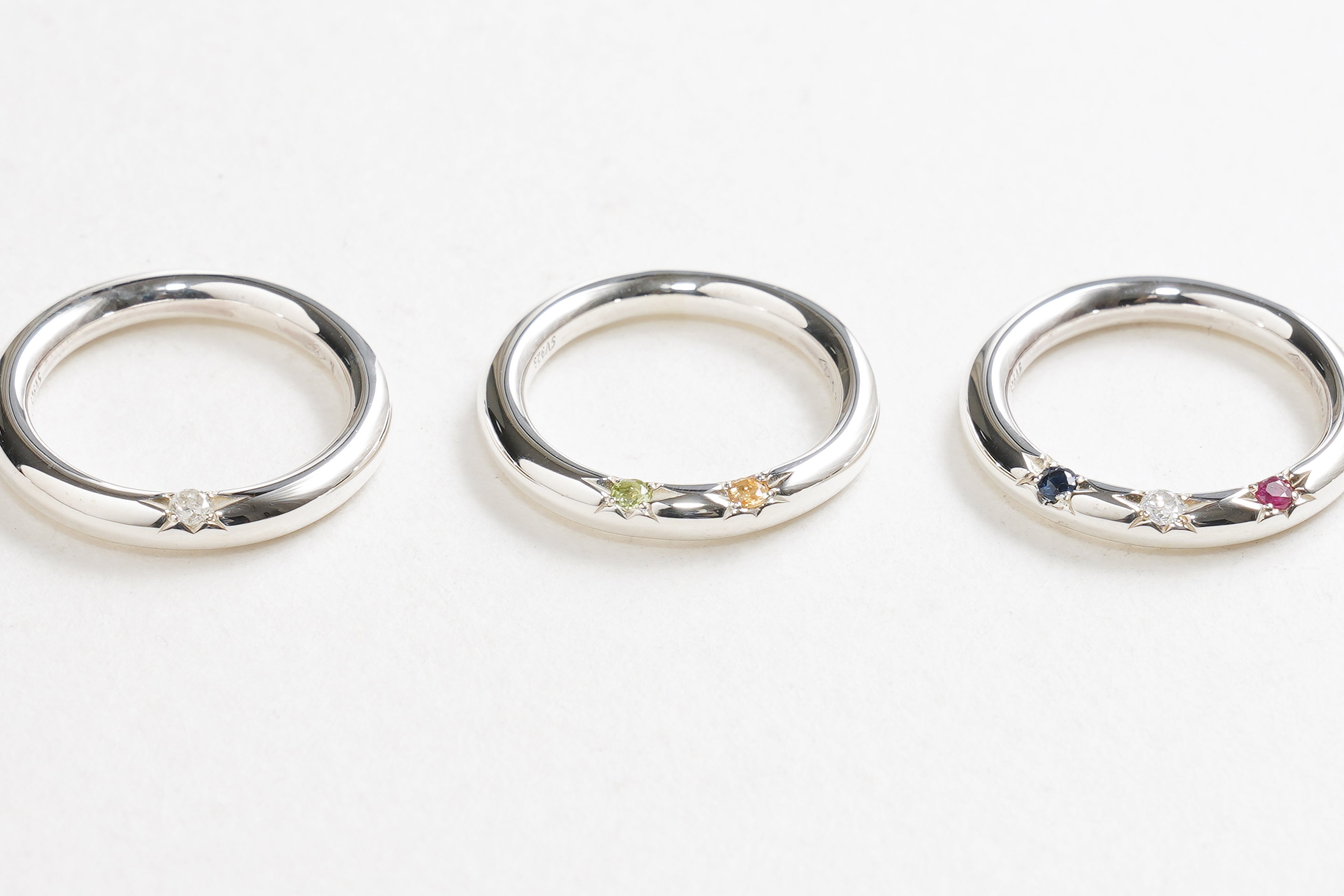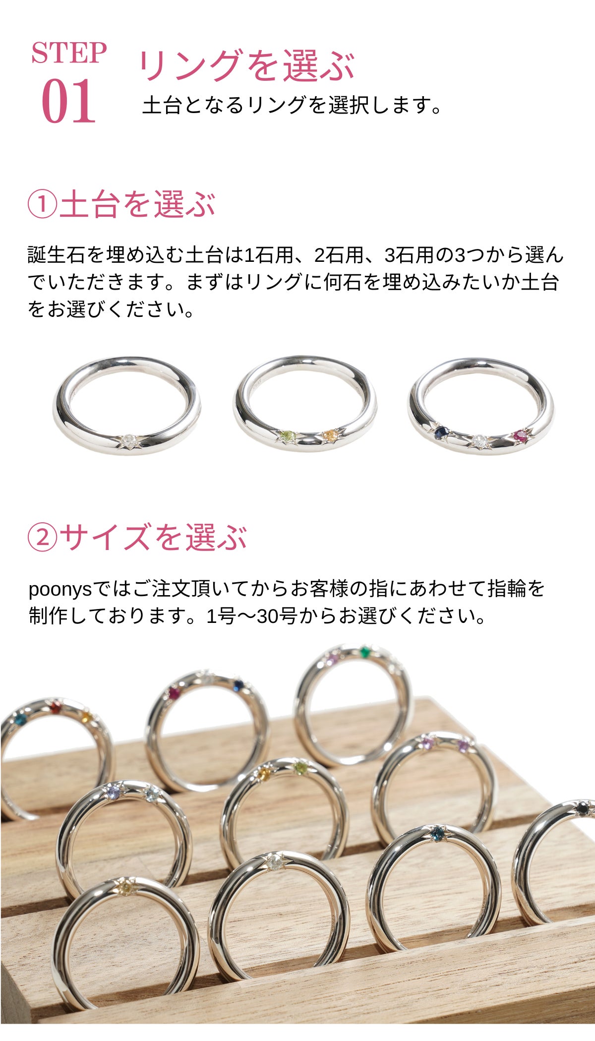 リング本体(1石・2石・3石の3パターン)を選び、本体に合わせた数の誕生石をリターンでそれぞれ選んで頂き、すべてを合わせて1つのリングに仕上げてお客様にお届けいたします!