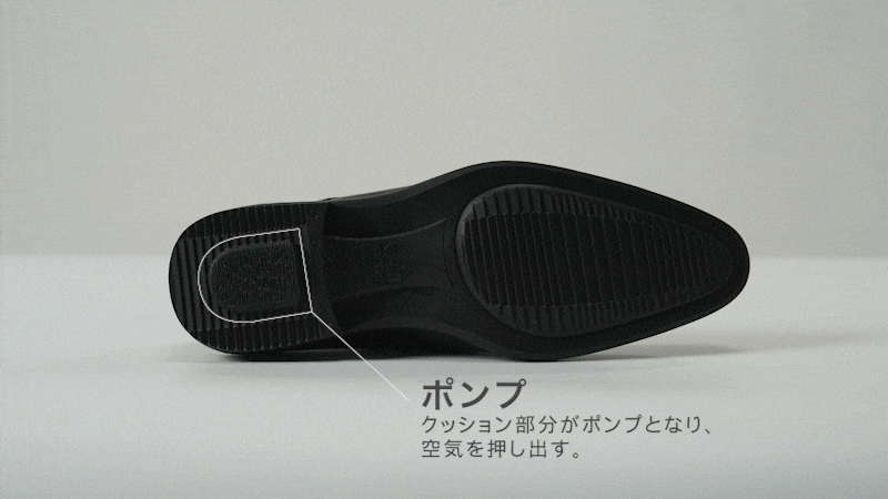 靴底のかかとにあるポンプはクッションの機能も果たし、長時間歩いても足が疲れにくい。もちっと厚いクッションの上を歩いているような感覚はやみつきになる人も多出。革靴にありがちな靴底の硬さを感じさせません。