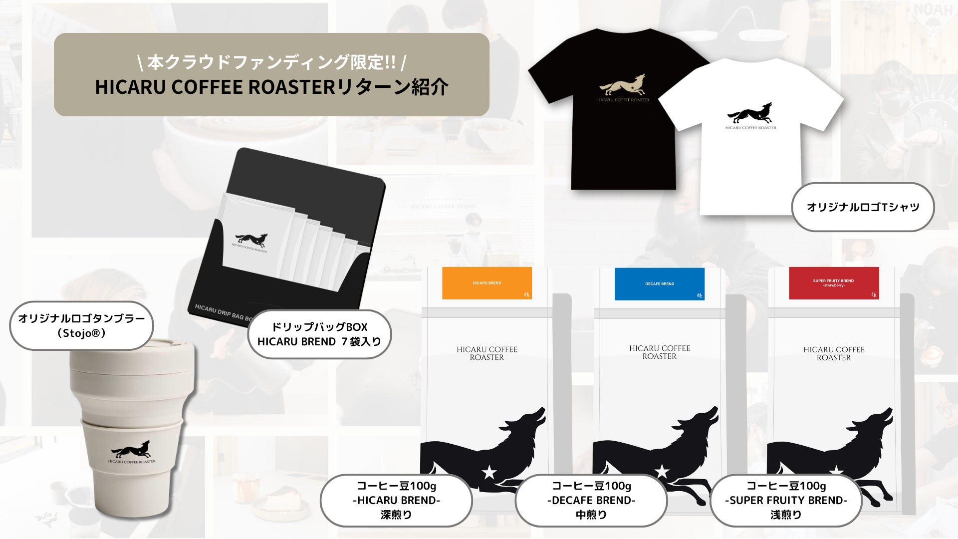 今回のクラウドファンディングをきっかけにブランドロゴをリニューアルしました。走り続けながら我々の想いをより広く遠くへ伝え、新たな仲間を探していくために、走りながら吠える狼のロゴをデザインしました。そんなデザインをあしらった限定グッズや、クラファン限定のブレンド豆をご用意しております。遠方でなかなかお店にご来店が難しい方々も是非この機会にHICARUのコーヒーを楽しんでもらえますと幸いです。