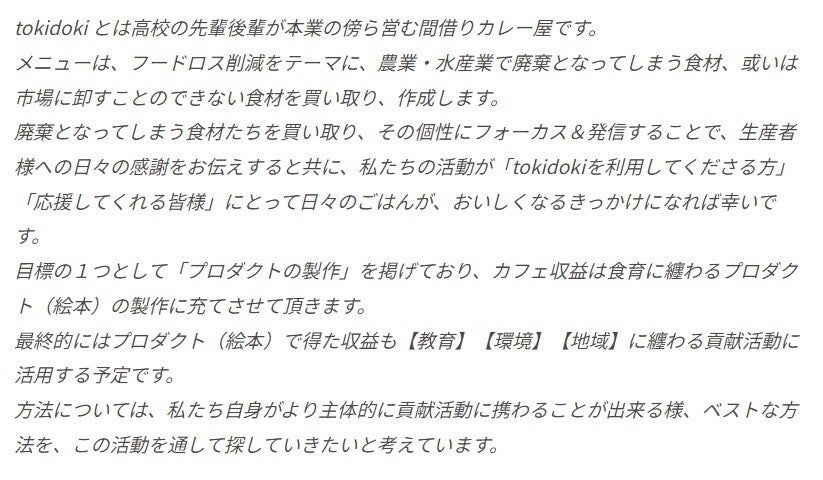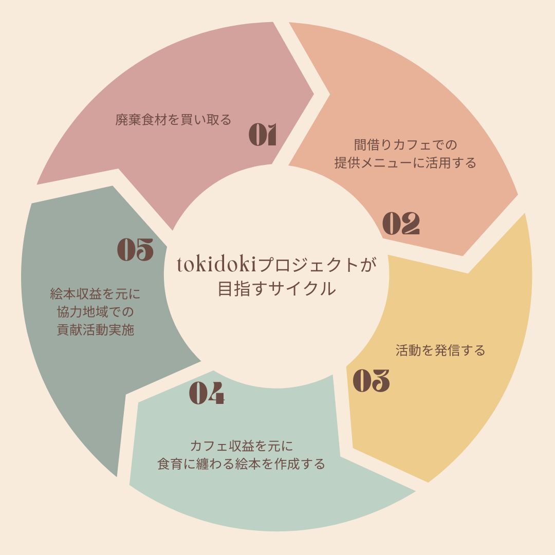 今回のCAMPFIREでご支援いただいた皆様、食材提供に協力頂く生産者さま、カフェをご利用頂く皆様については、貴重な協力者・支援者であると共に、フードロス削減→食育プロダクト作成→地域貢献活動、というサイクルを作るチームメイトだと思っています。