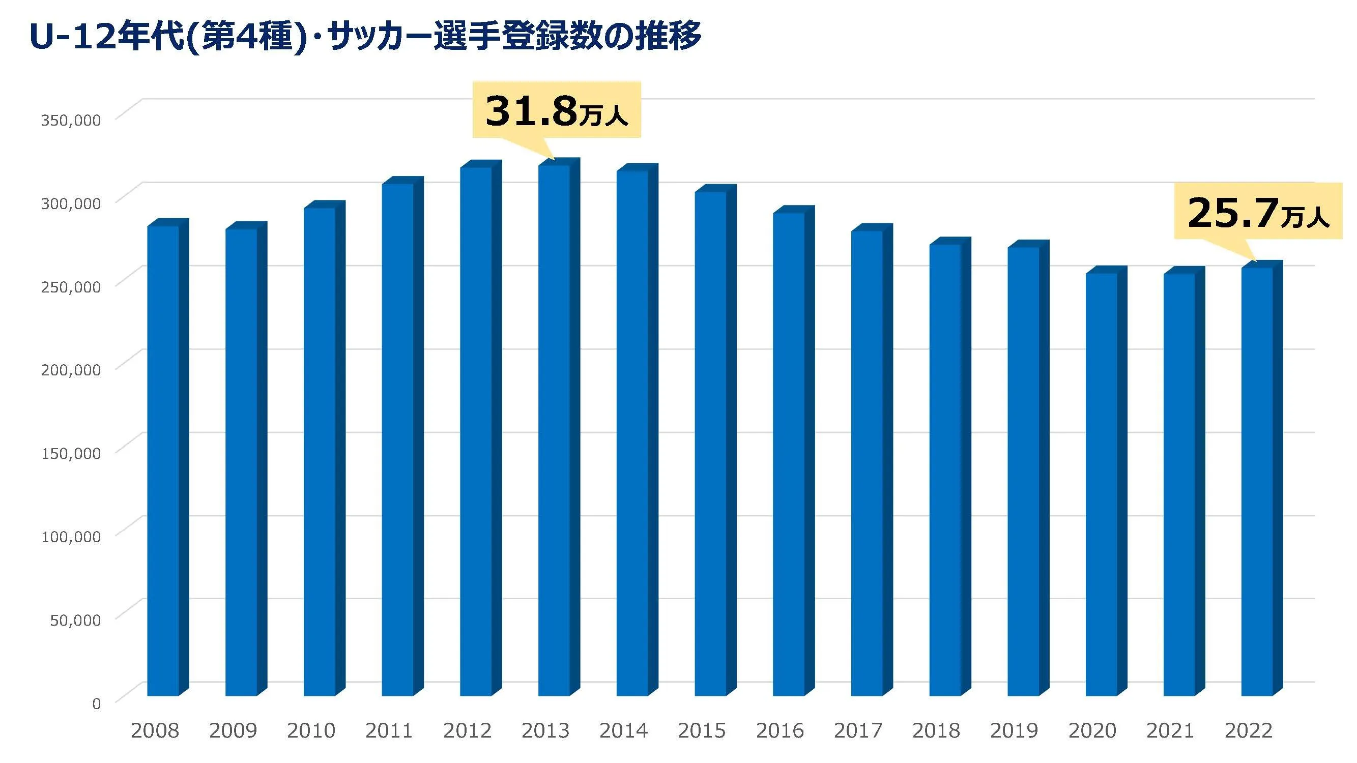 子供たちへの普及活動はフットサル界のみならず、サッカー界全体に大きな課題として認識されています。(公財)日本サッカー協会の集計では、12歳以下の登録人口は、過去10年で約6万人減少したとされています。少子高齢化社会を迎え、子供世代の人口が減少している我が国において、子供たちへサッカー・フットサルを普及していくことは非常に重要なポイントとなっています。