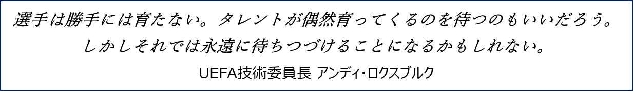 「日本がワールドカップのトロフィーを掲げる」― そのために重要な要素の一つが、さらなる競技力の向上であることは間違いありません。世界に目を向けても、各国の代表チームの成果を遡ると、必ずそこには世界大会におけるユース年代の成果が見られ、ユース育成の質こそが強い代表チームの鍵となっています。