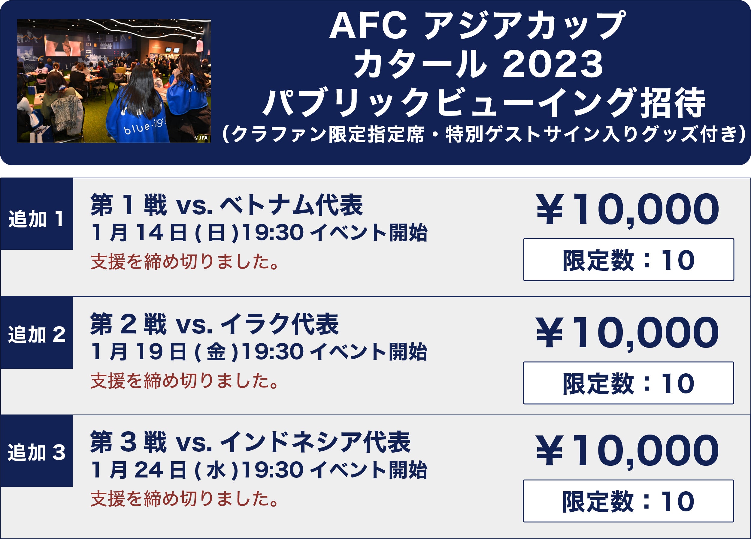 2024/02/01 16:2812月7日(木)に開始した本クラウドファンディングは、昨日1月31日(水)をもって終了いたしました。56日間の挑戦にお付き合いいただき、たくさんの応援とご支援をいただき、本当にありがとうございました。支援総額:19,739,500円(達成率65%)支援者数:621人3000万円という目標金額を達成することはできませんでしたが、全国のサッカーファミリーの皆さまからのあたたかいご支援と熱い応援のメッセージをいただくことができ、本当に感謝しております。日本サッカーを愛する皆さま一人ひとりの想いをしっかり受け止めて、今後もユース育成の取り組みを進めていきたいと思います。リターンに関しては準備ができ次第、順次お届けさせていただきますので、どうぞ楽しみにお待ちください。また、今後、能登半島地震により被災された地域や避難されたサッカーファミリーが、これまでどおり、誰もがいつでもサッカーを楽しむことができる環境の復興を目的としたクラウドファンディングを実施させていただく予定です。一日も早く被災地の皆さまが笑顔でサッカーを楽しむことができる環境を取り戻すために、皆さまのお力をいただけますと幸いです。そして昨日は、アジアカップ ラウンド16 バーレーン代表戦の応援もありがとうございました!次戦は2月3日(土)20:30 vsイラン代表 です。頂点まであと3つ。引き続き応援をよろしくお願いします!改めまして、本プロジェクトにご支援してくださった皆さま、応援してくださった皆さま、本当にありがとうございました。 もっと見る