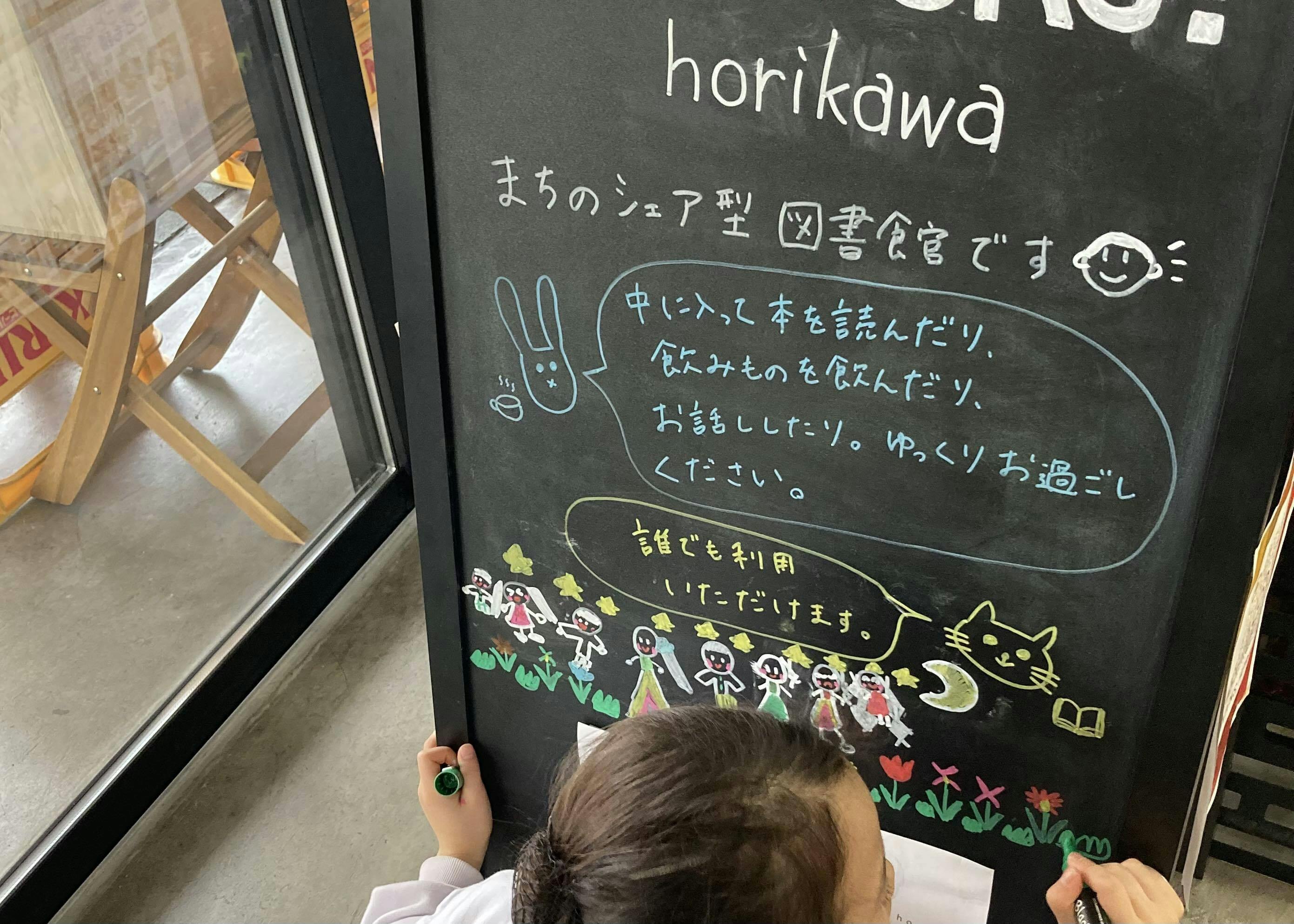 2024/02/28 17:35※写真は、立て看板に絵やメッセージを書いている様子ガラス窓で中は見やすいものの、何をしているのか、果たして入っていいものなのか、分からなかった...そんな声も聞かれたので、どなたでも入って良い場所であることをわかりやすくするため、立て看板に書いてみました。立ち止まって中に入ってくれる人も増え、オープンしている日に1、2名は初めましての方に来館いただいています。============================================knocks! horikawa 3月オープンスケジュールknocks! horikawaでは、イベントをいくつか予定しています。2月3日(土)10:30〜13:00 本を片手に交流会3月20日(水)10:00〜12:00 月イチだれでも音楽室3月23日〜4月7日 オープンスクールオープンスクールは音楽や理科実験、習字、ボードゲームなど、子どもも大人も学んで楽しめるワークショップが盛りだくさんな2週間です。チラシや申し込みフォームができたら、SNSやサイトにアップしますので、フォローいただけますと幸いです。============================================knocks! horikawa公式ホームページhttps://sites.google.com/view/knockshorikawa︎knocks! horikawaにある、みんなの図書館Facebookhttps://www.facebook.com/mintosho.knockshorikawa もっと見る
