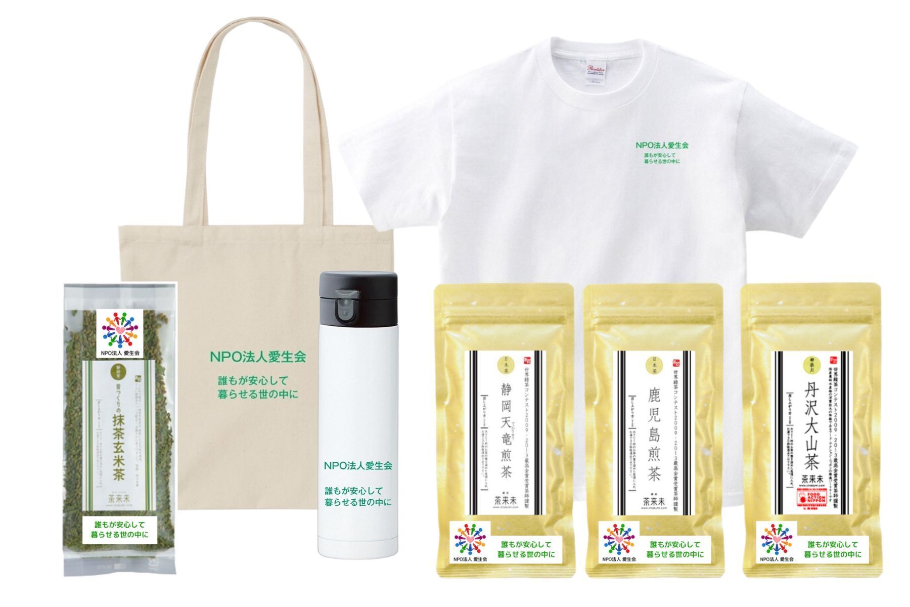 100,000円 お礼のメッセージ、ステンレスボトル、Tシャツ(1枚)、トートバッグ(1枚)、お茶(日本各地のお茶3種) 、ホームページに名前を掲載、名誉賛助会会員