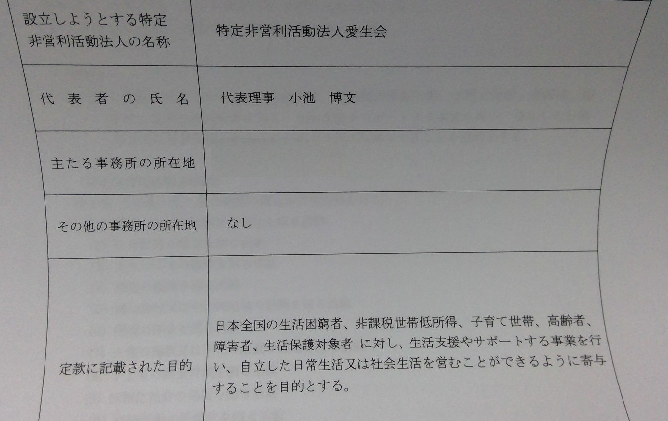 自治体、NPO法人、団体の生活弱者への対応の問題や、生活保護が決定するまでの期間の生活の保障がされていない事や、サポートの不足など数えきれないほどあります。その様な問題点を総合的にカバー出来るようにと考えて、NPO法人を設立します。