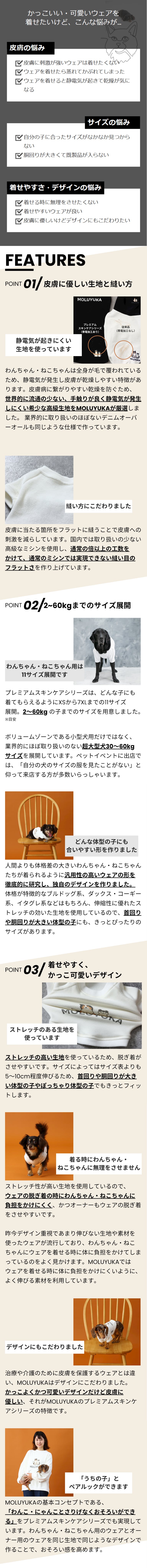 「プレミアムスキンケア」シリーズは、わんちゃん・ねこちゃんの皮膚を守るウェアです。わんちゃん・ねこちゃんにとっても皮膚(肌)に優しいことは重要です。家族の一員であり、私たちのパートナーであるわんちゃん・ねこちゃんだからこそ、健康であって欲しい、皮膚トラブルで悩んで欲しくない、そんな思いをもって私たちは「プレミアムスキンケア」シリーズを展開し、皆様のパートナーにお届けしたいと思っています。