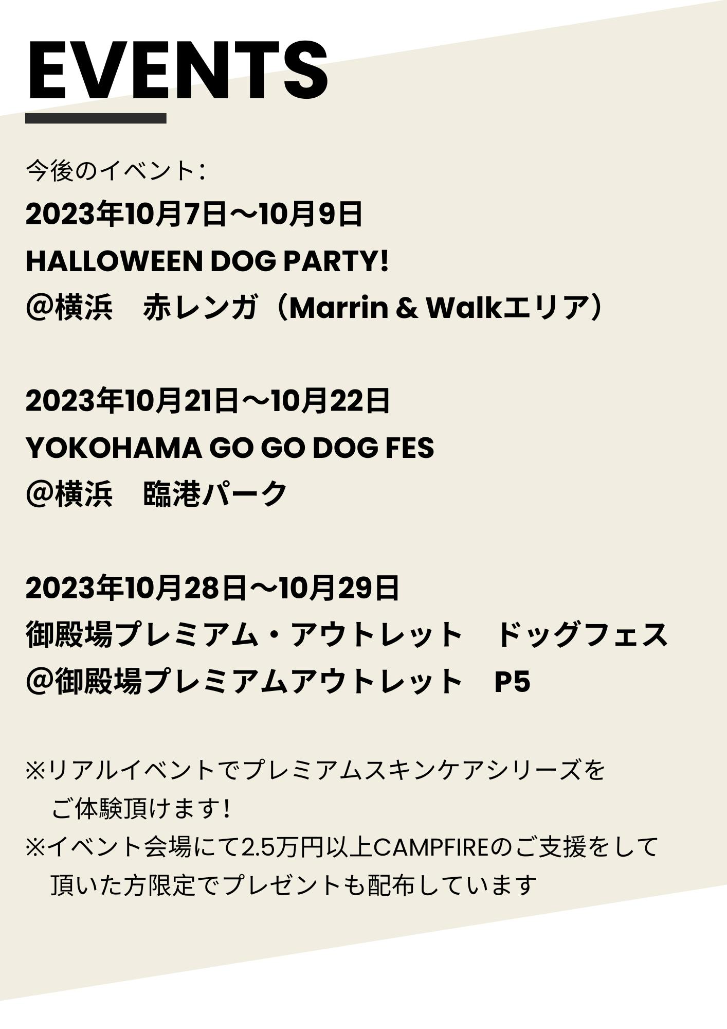 A3:MOLUYUKAはペットイベントに参加しております。その際、今回のクラファンでご支援を募っているプレミアムスキンケアシリーズについてサンプルを持って行きますので、実際にお確かめ頂くことが可能です。
