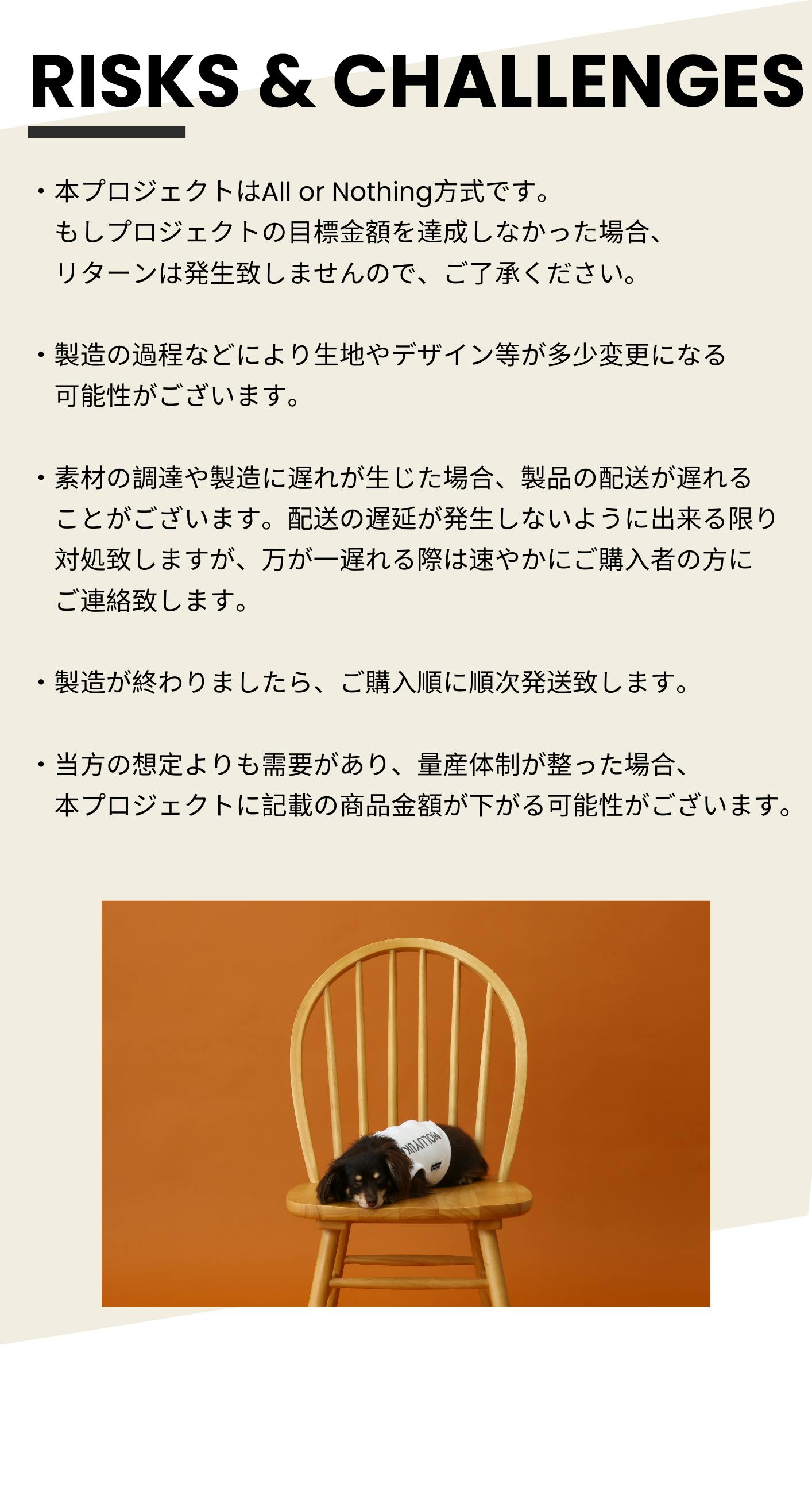 わんちゃん・ねこちゃんの皮膚に優しいウェアをより多くの皆様に届けるべく、次は70万円を達成したいと思いますので、引き続き、皆様からのご支援を頂けますと幸いです。
