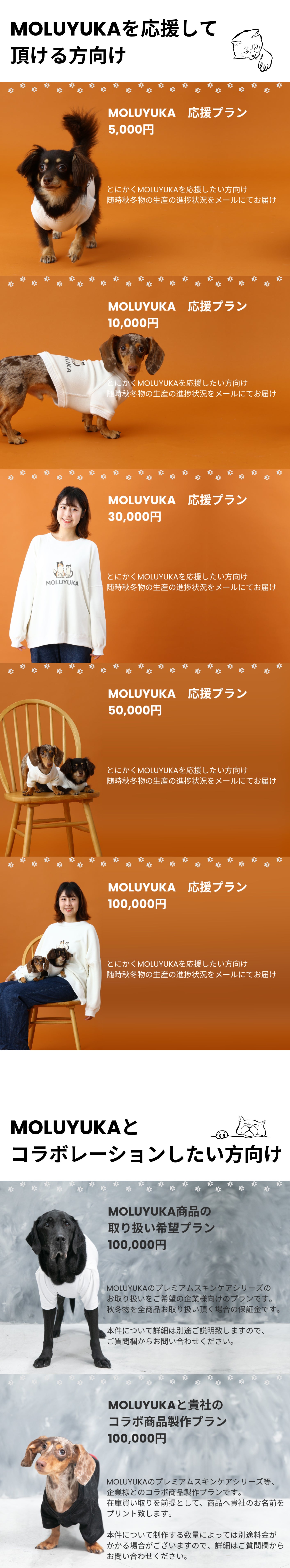 A4:今回クラファンでご支援を募っている秋冬物は現在は本クラファンのみの販売となります。以前生産したオールシーズン物については既に販売しております。MOLUYUKAのオンラインサイトをご覧頂くか、ペットイベントにお越し頂きご覧頂けますと幸いです。