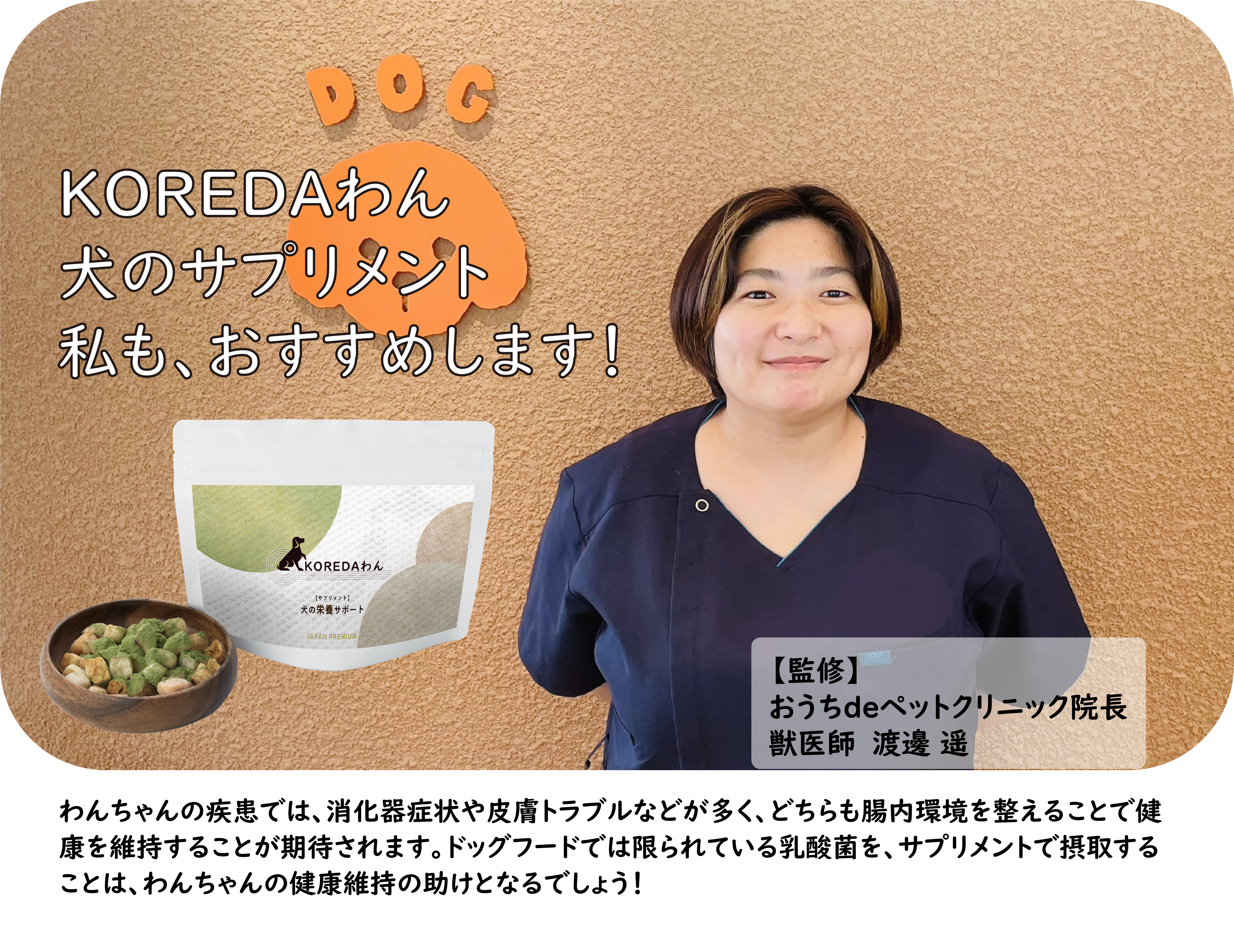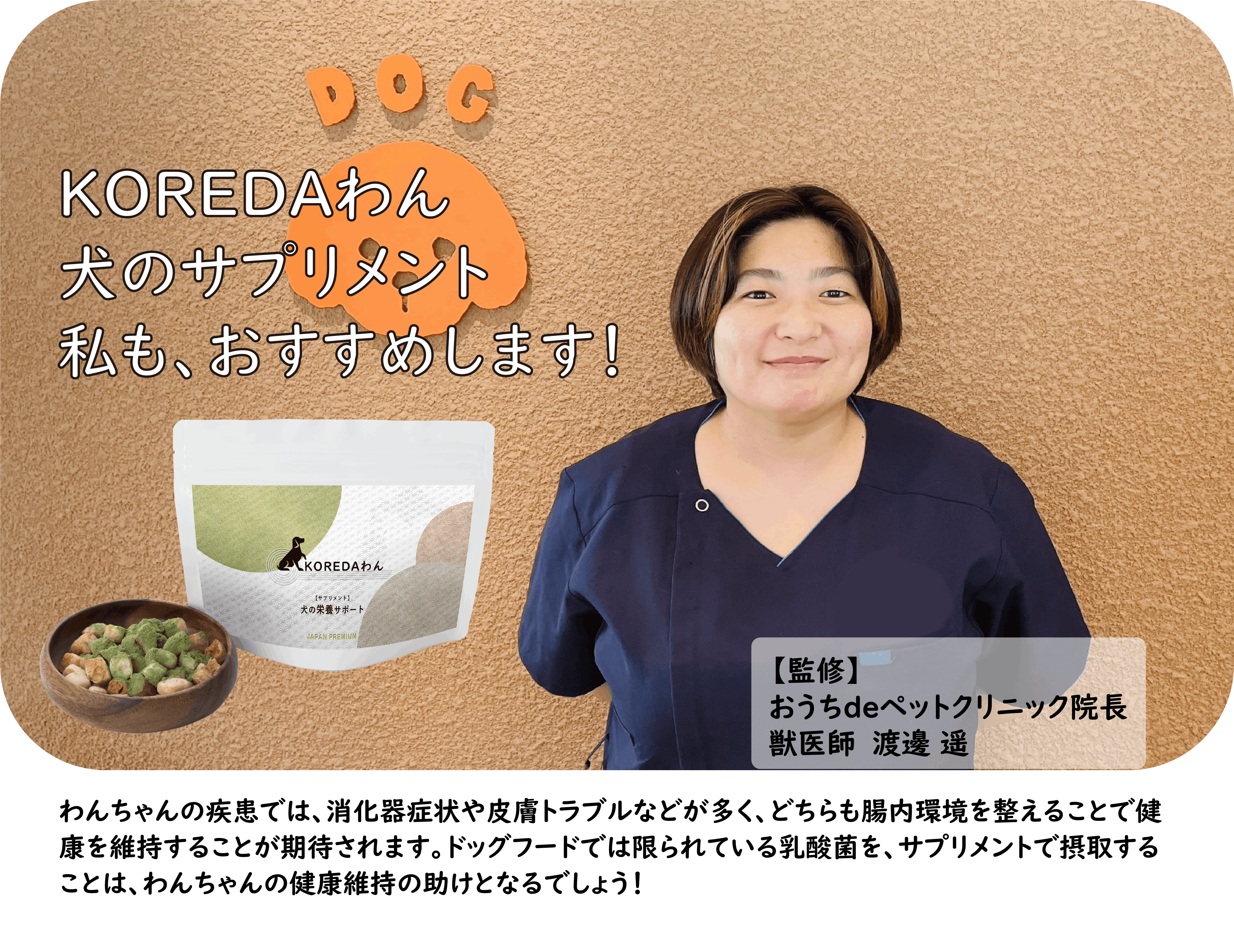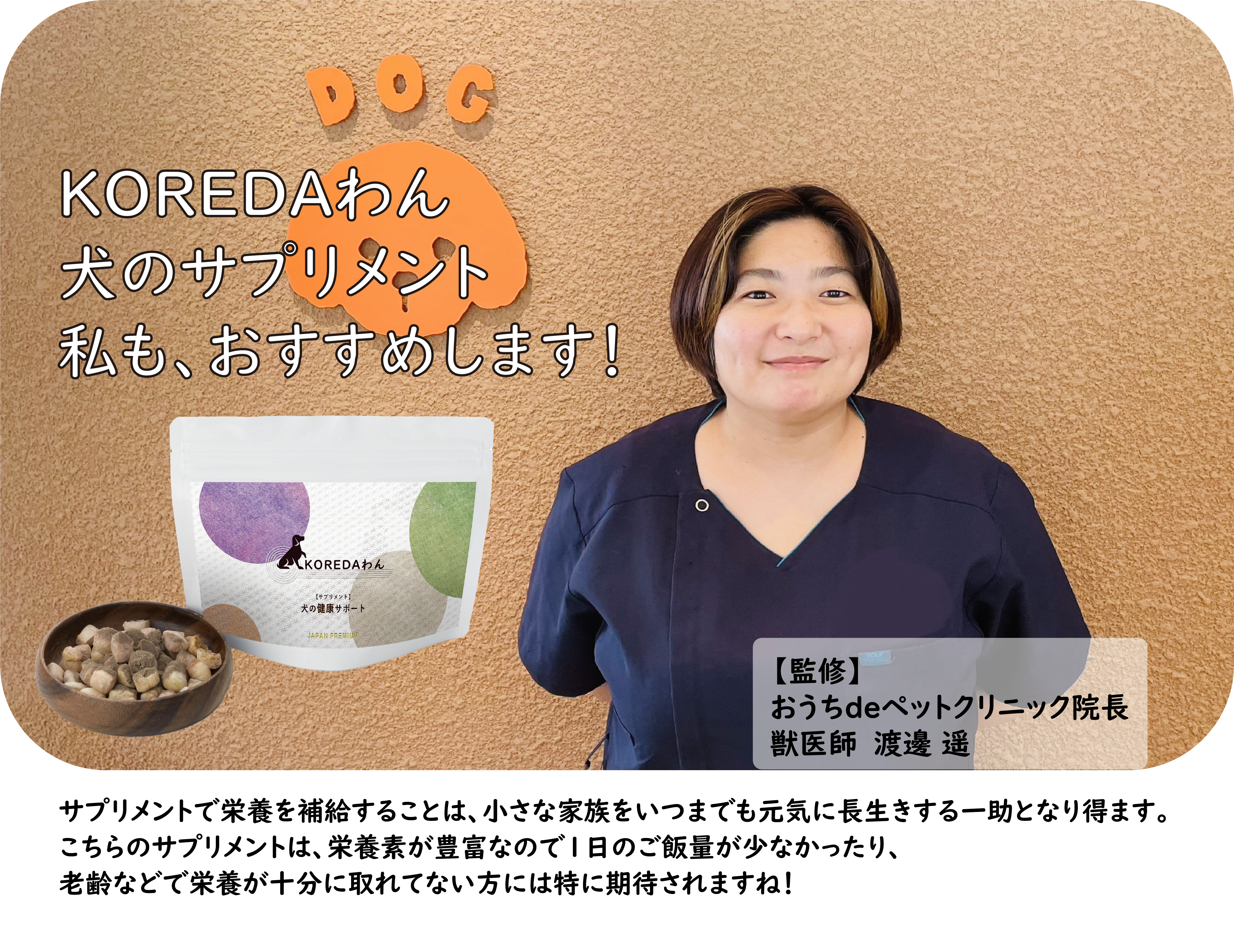 わんちゃんも人間と同じように予防医学の考え方から、病気になってから対処するのではなく、日々バランスよく栄養を摂ることで予防的に健康を維持し、病気になりにくい健康的なカラダづくりをすることで、わんちゃんと飼い主様の幸せな日常生活をより育んでいただきたい。『KOREDAわん』犬のサポートサプリメントが、そのサポートとなることを願っております。